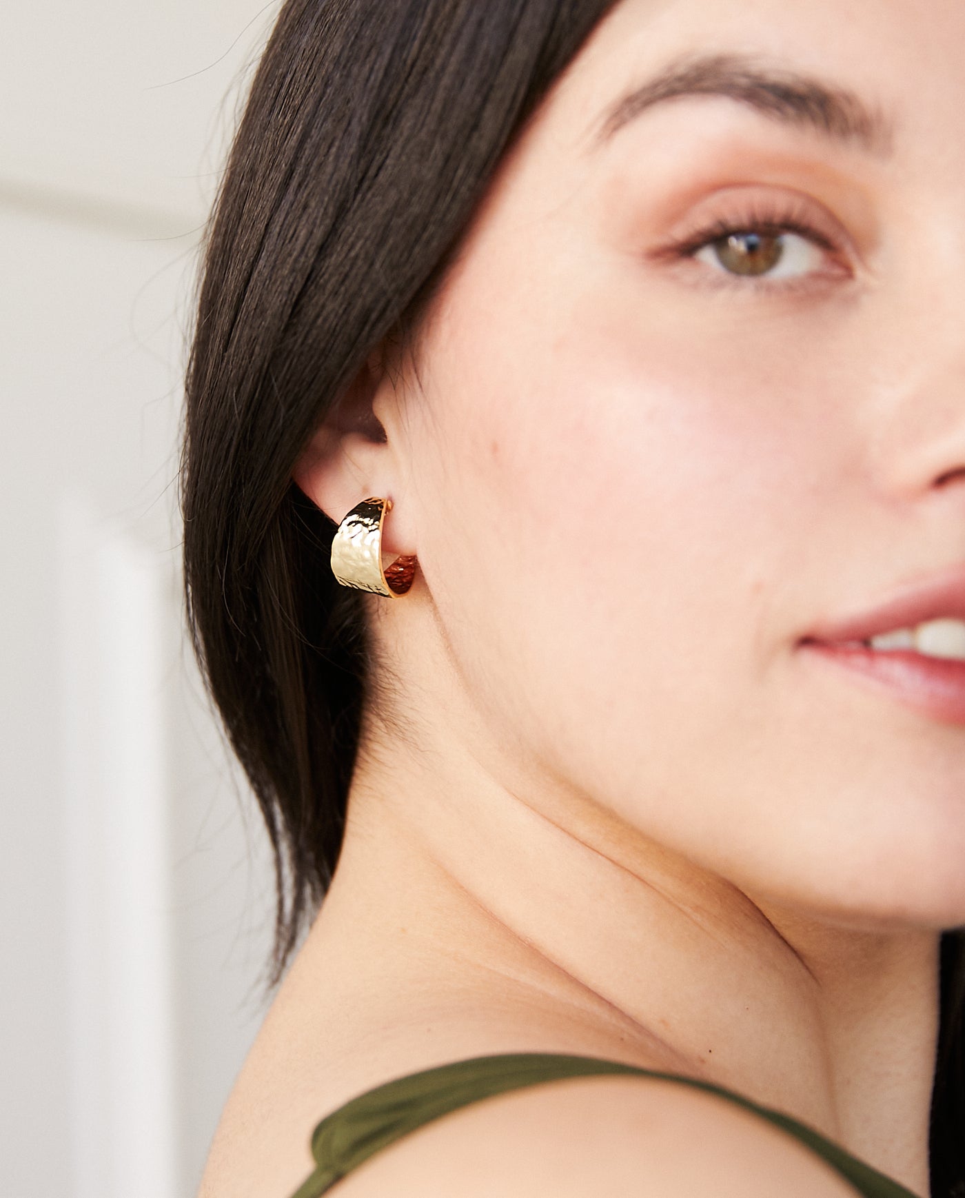 Estos aros tienen un diseño sencillo y elegante, con una base dorada de forma curva. La superficie es texturizada, creando un efecto de ondas o pliegues. Son ideales para un estilo sofisticado, perfecto para ocasiones formales o para darle un toque de distinción a un look diario.
