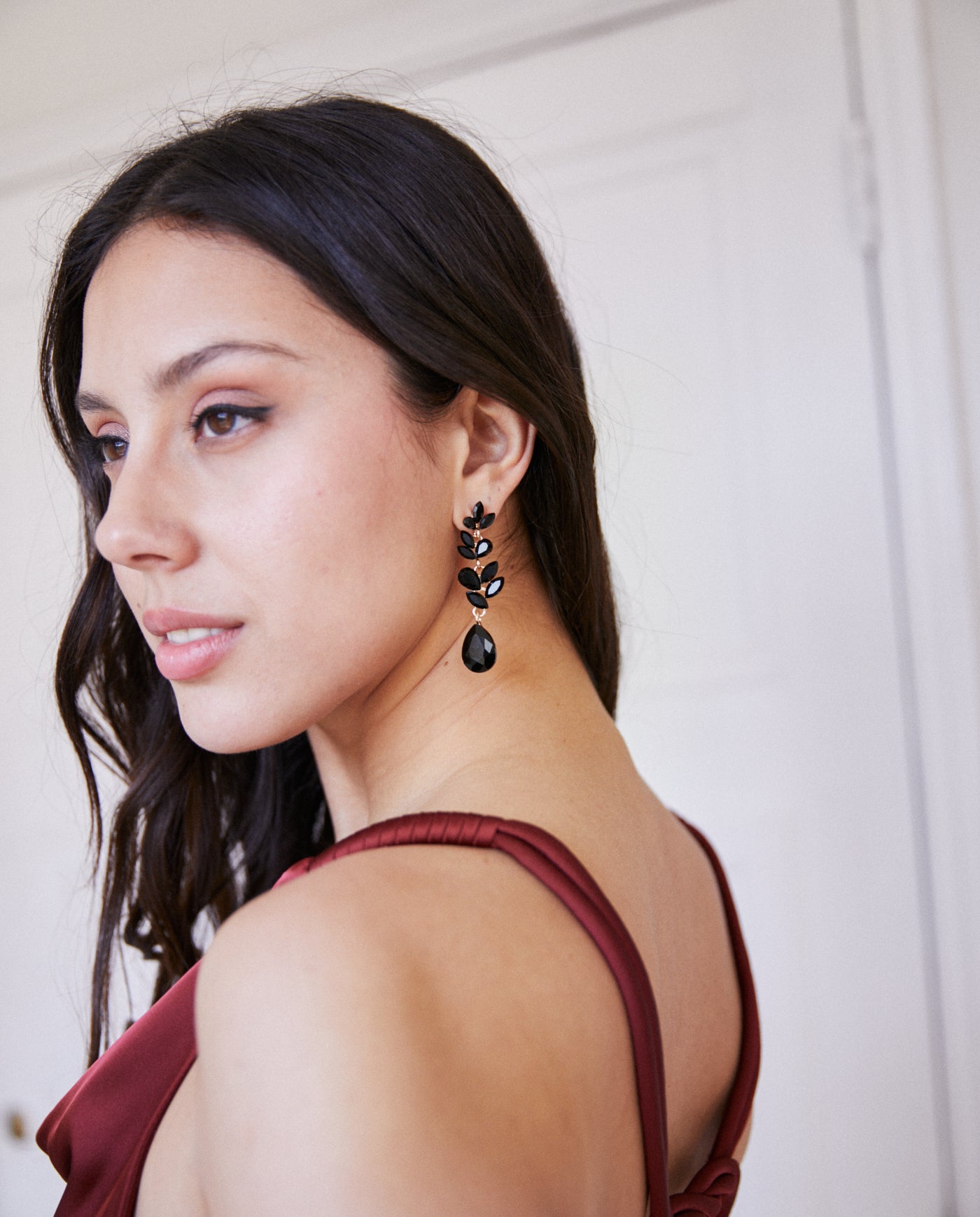 Estos aros tienen un diseño elegante con cristales transparentes en forma de hojas y una gota en la parte inferior. La base dorada resalta el brillo, dándoles un toque sofisticado y moderno, ideales para ocasiones especiales.