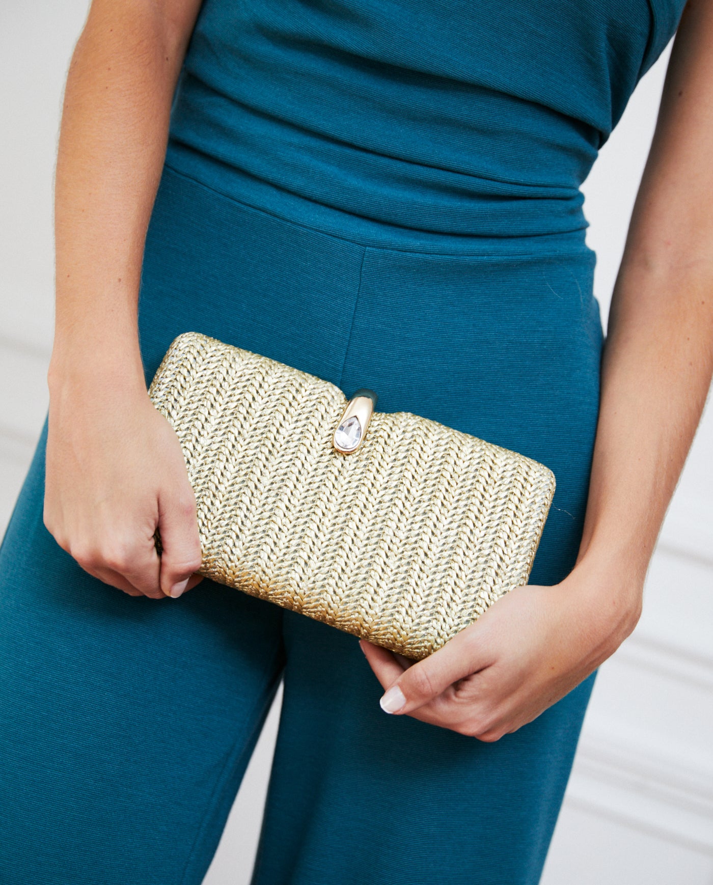Clutch Isadora Rafia es una cartera de fiesta elegante confeccionada en rafia, en tono dorado, con un acabado brillante. Su diseño destaca por su cierre que posee una aplicación de piedra brillante, que aporta un toque sofisticado y femenino. Es ideal para usar en matrimonios, eventos corporativos, bautizos y celebraciones, complementando tus looks con un estilo elegante. Esta cartera pertenece a nuestra Colección Propia, realizada con mucho amor y pensada en todos sus detalles para ustedes.