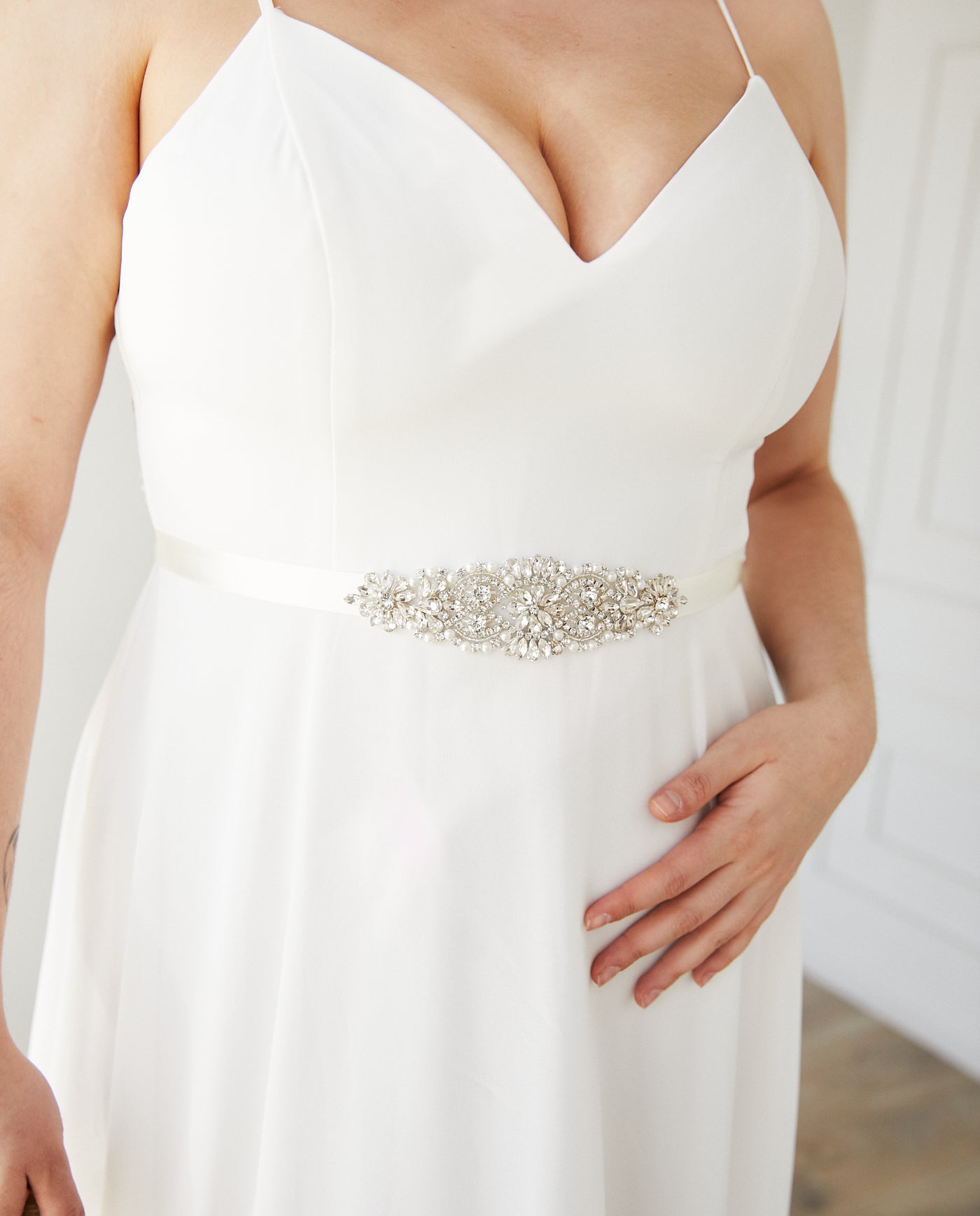 Cinturón Novia Ema Corto Plateado Cinta Ivory