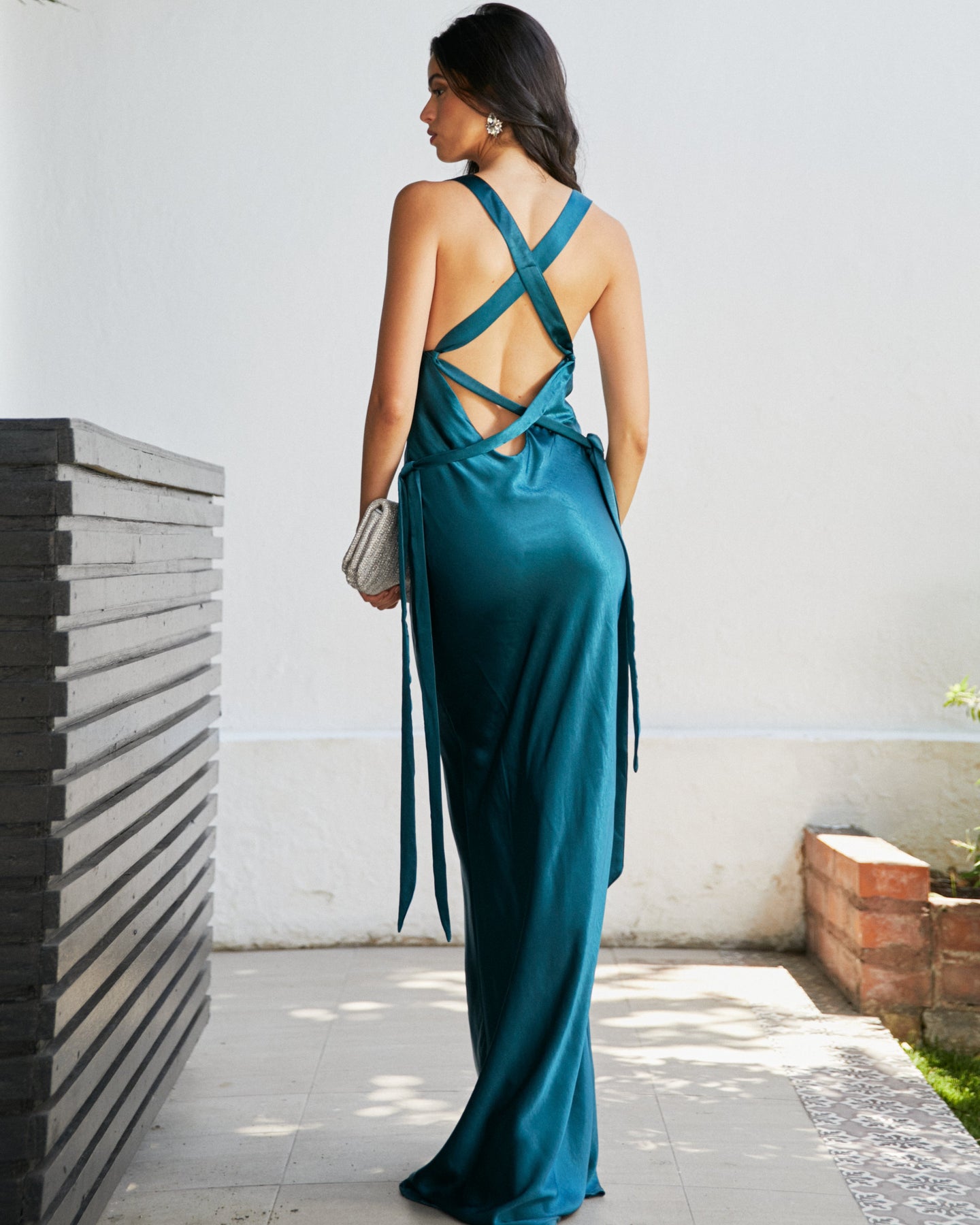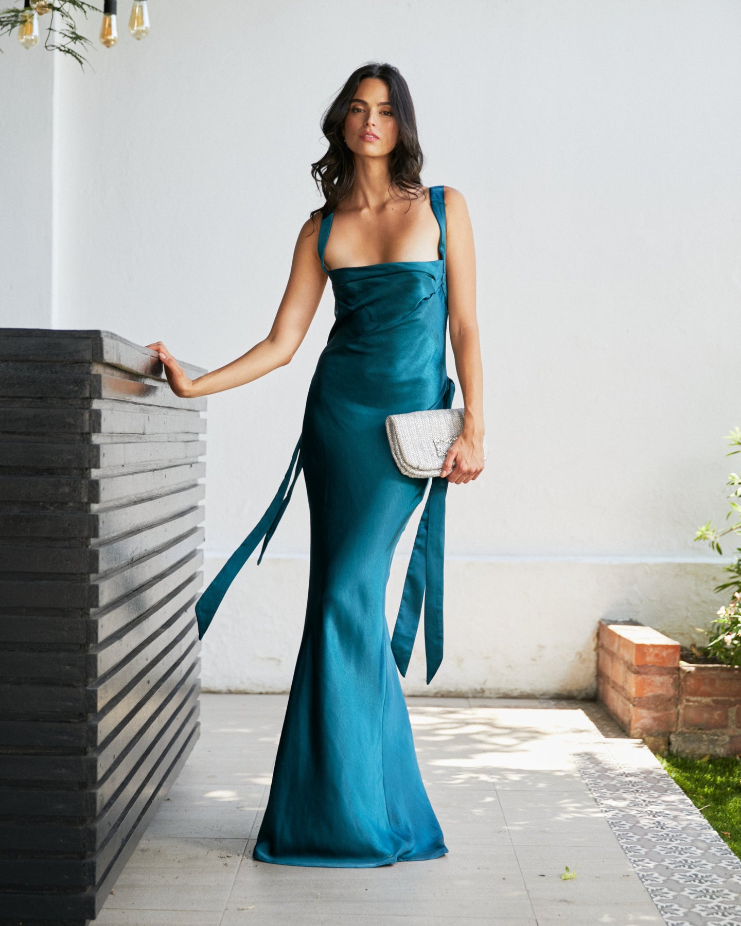 Vestido Largo de Fiesta Capri Turquesa Oscuro confeccionado en satín tela no elasticada, con vestido espalda rebajada, tirantes ajustables que se ajustan y adaptan a tu figuara. Su diseño largo ofrece un look elegante y femenino, ideal para invitada matrimonio de noche, graduación, fiesta gala. Este vestido es parte de nuestra colección ee.uu.