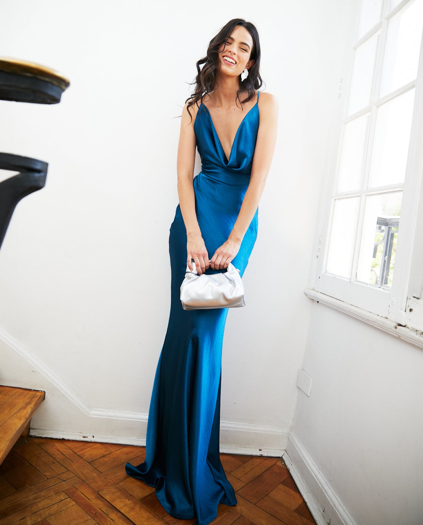 Vestido Largo de Fiesta Dominga Turquesa Oscuro confeccionado en satín tela no elasticada, con vestido espalda rebajada que realzan la silueta. Su diseño largo ofrece un look elegante y femenino, ideal para invitada matrimonio de noche, graduación, fiesta gala. Este vestido es parte de nuestra colección ee.uu.