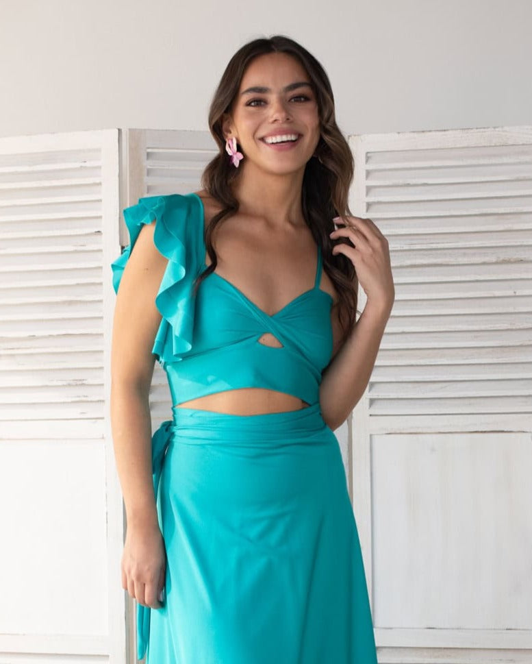 Este conjunto es perfecto para ocasiones especiales o para destacar en cualquier evento, está disponible en vibrantes colores que irradian confianza y feminidad.