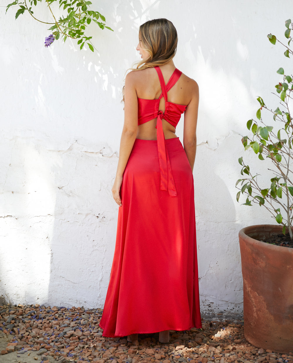Nuestro Antonieta es un vestido largo confeccionado en tela satinada.Tiene un escote delantero estilo halter, que quita volumen en la parte de los hombros. Se ajusta con lazos que van desde el cuello y la parte delantera y se anudan en la espalda y caen.