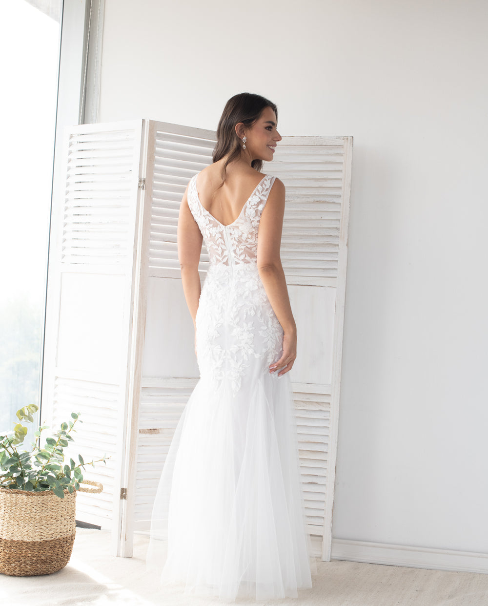 Su corte es sirena, por lo que es más ajustado en las caderas, hasta las rodillas, luego bajo estas posee pinzas que hacen que el tul sea mas vaporoso y cómodo al caminar.