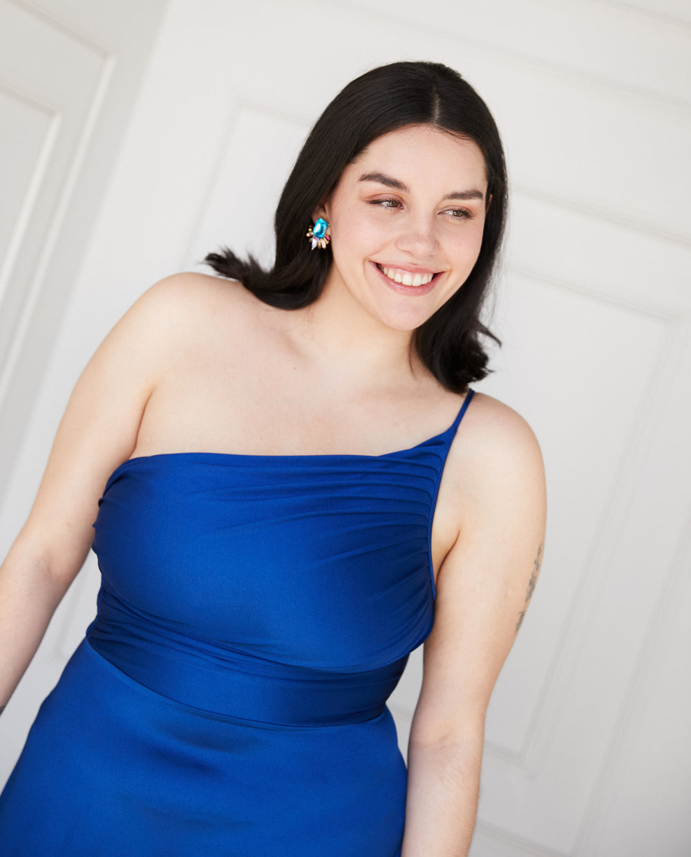 El Vestido Loreto Azul Royal está confeccionado en lycra elasticada con caída fluida que acompaña el movimiento. Su escote asimétrico y espalda media aportar una presencia moderna y femenina. Confeccionado en Chile con <3.