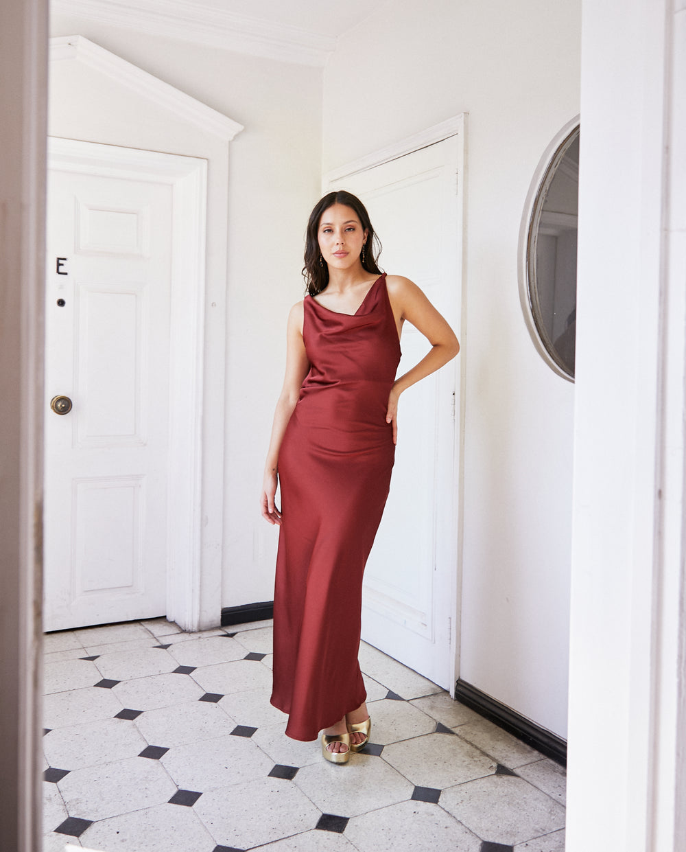 Nuestro vestido Monstserrat está confeccionado en tela satinada, no elástica. El escote tiene un sutil drapeado y posee tirantes dobles que se unen y que van hacia la espalda y se cruzan en el medio de la espalda. El diseño tiene un corte recto, por lo que se ajusta sutilmente sobre las caderas. Este vestido lo puedes usar de día o de noche, en matrimonios, eventos de empresas, graduaciones, etc. Recomendamos dejar el escote libre para lucir el diseño drapeado del vestido. Este vestido estiliza tu cuello y hombro. Si tienes poco busto, este escote será perfecto para ti.