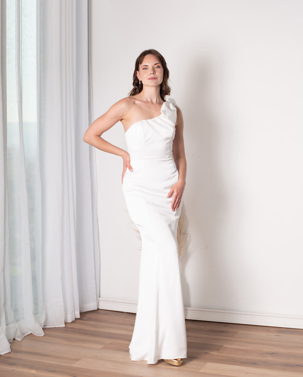 Ginebra es un vestido largo, confeccionado en tela satinada plana no elasticada. El diseño posee escote asimétrico con un hombro al lado izquierdo. Posee una apliación de roson sobre el hombro, que deja caer hacia la espalda tela. Cuenta con cierre invisible en la espalda. Su diseño es ajustado sobre las caderas, y luego cae recto hacia el ruedo. Es un vestido ideal para una ceremonia de matrimonio civil, para un segundo vestido en tu gran fiesta o eventos y graduaciones. I