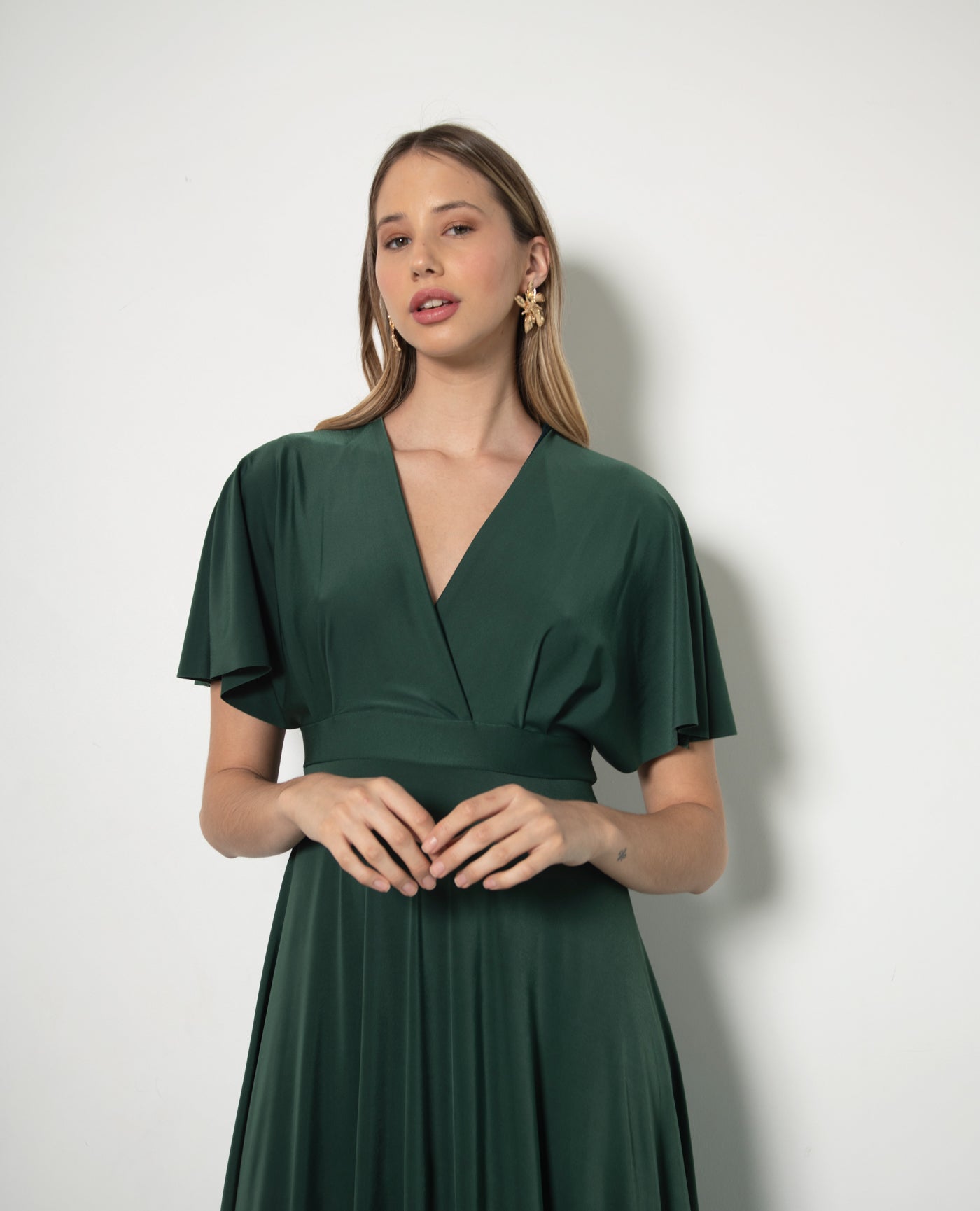Noa es un vestido largo de fiesta confeccionado en lycra dupont, que es una tela ultra elástica que se adapta muy bien al cuerpo. Tiene un escote en V y mangas anchas. Su diseño tiene un corte que resalta la cintura, acompañado de un lazo que puedes amarrar hacia adelante o en la espalda. Además tiene una abertura vertical en la espalda que le da un toque único. Tiene un amplio faldón con una linda caída. ¡Este vestido tiene un peso y movimiento increíble! Lo puedes usar de día o noche, en matrimonios al aire libre o interior y graduaciones. Lo puedes complementar según la ocasión, te aconsejamos si es de día, utilizar colores contrastantes, en formatos de aros más casuales como flecos o aros de papel. Si es de noche, puedes usar colores más clásicos como dorado, plateado o brillantes. Este vestido tiene un escote en V estiliza tu cuello, además te sentirás cómodo y seguro por la forma del escote y sus mangas abiertas.