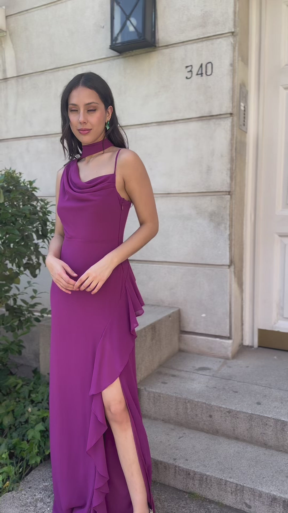 El Vestido Maia Morado, confeccionado en gasa no elasticada, combina delicadeza y elegancia. Su escote asimétrico con choker y abertura lateral estilizan la figura y aportan un toque moderno. Perfecto para graduaciones o eventos de noche. Confeccionado en la colección EE.UU.
