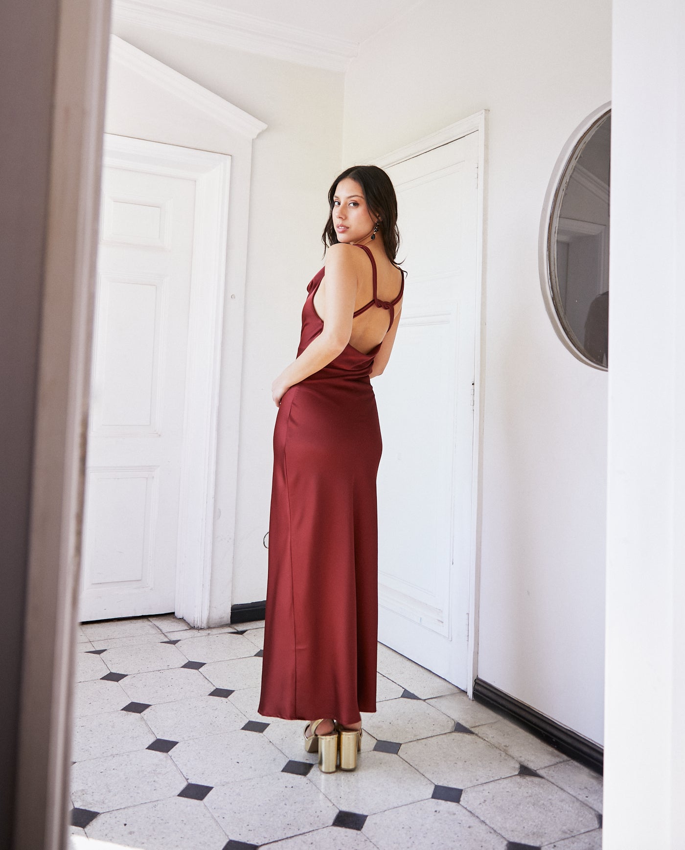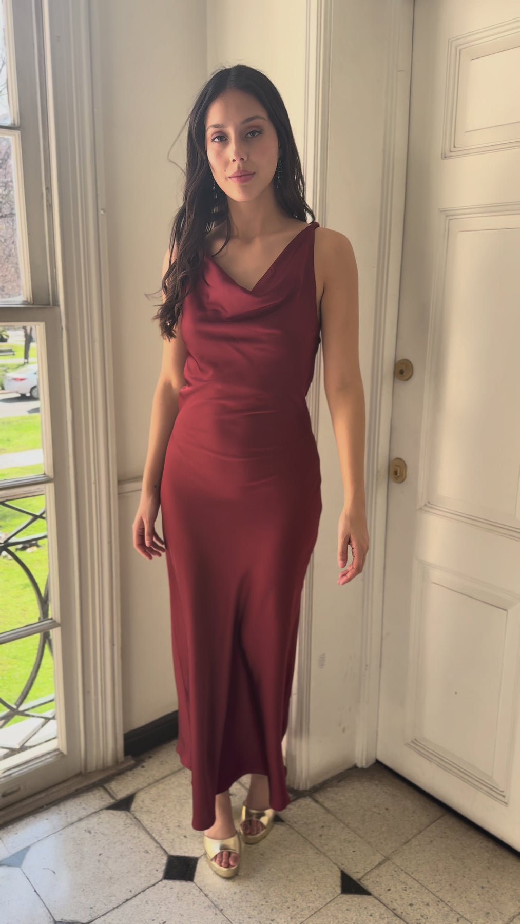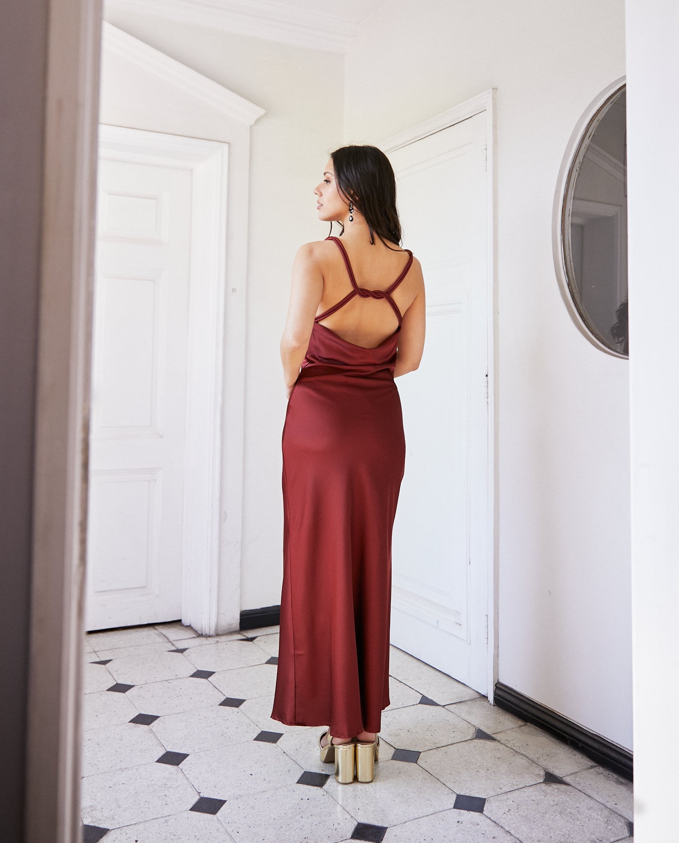 Nuestro vestido Monstserrat está confeccionado en tela satinada, no elástica. El escote tiene un sutil drapeado y posee tirantes dobles que se unen y que van hacia la espalda y se cruzan en el medio de la espalda. El diseño tiene un corte recto, por lo que se ajusta sutilmente sobre las caderas. Este vestido lo puedes usar de día o de noche, en matrimonios, eventos de empresas, graduaciones, etc. Recomendamos dejar el escote libre para lucir el diseño drapeado del vestido. Este vestido estiliza tu cuello y hombro. Si tienes poco busto, este escote será perfecto para ti.