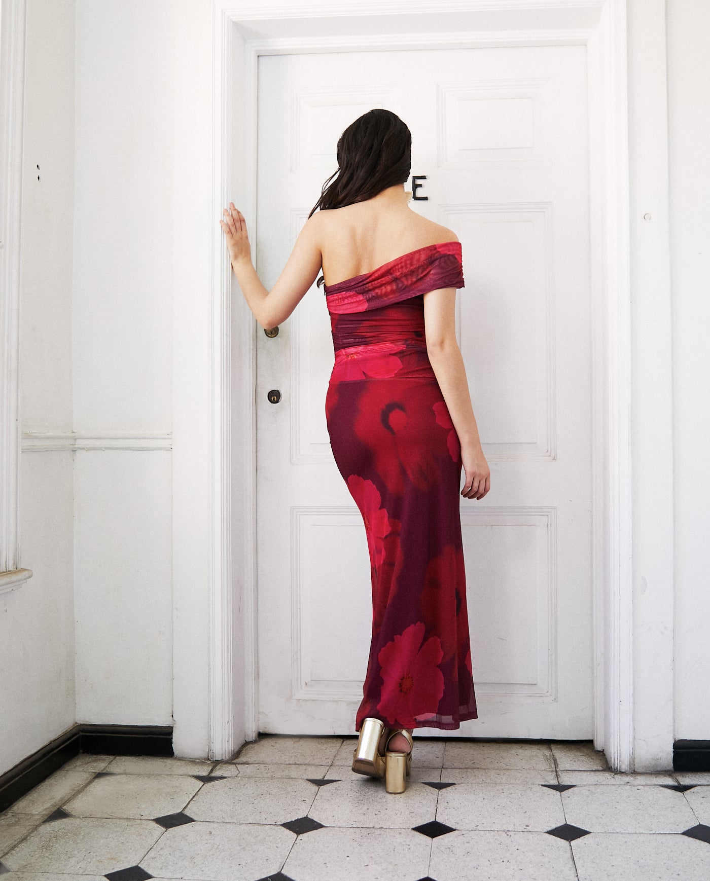 Este vestido de fiesta es elegante y sofisticado, con un diseño de una sola manga que aporta un toque moderno. El color burdeos resalta y es ideal para eventos formales como bodas, graduaciones o cenas elegantes. La tela es elasticada, ajustada en la parte superior, con detalles de fruncidos que definen la figura, mientras que la falda cae suavemente en línea recta, lo que da un efecto estilizado.