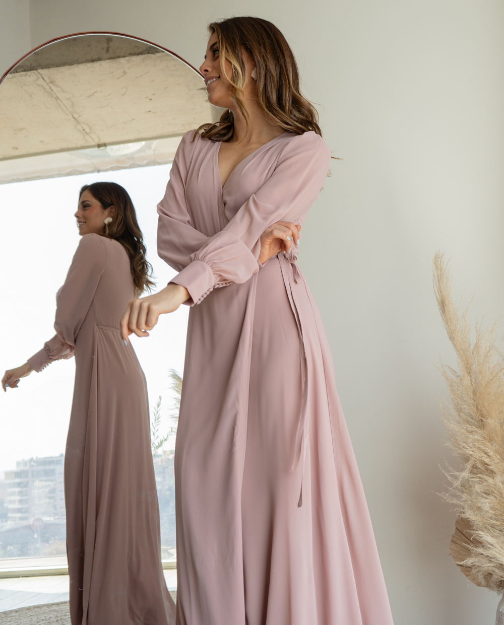 Vestido Largo De Fiesta Jacinta Manga Larga Palo Rosa