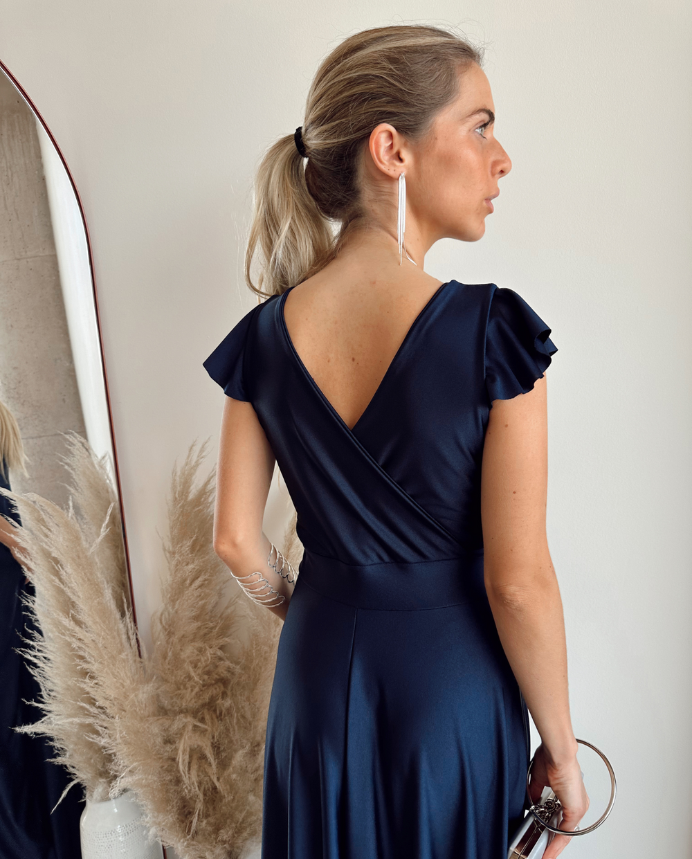 Es un vestido versátil que puede ser usado tanto para un matrimonio de noche, como para un evento en el día, todo depende de los accesorios que complementen el look. Puedes usar aros en tonos dorados, plateados o brillos para lograr un estilo clásico y elegante. También puedes darle un look más informal con aros de flecos o de papel en tonos que contrasten el vestido.