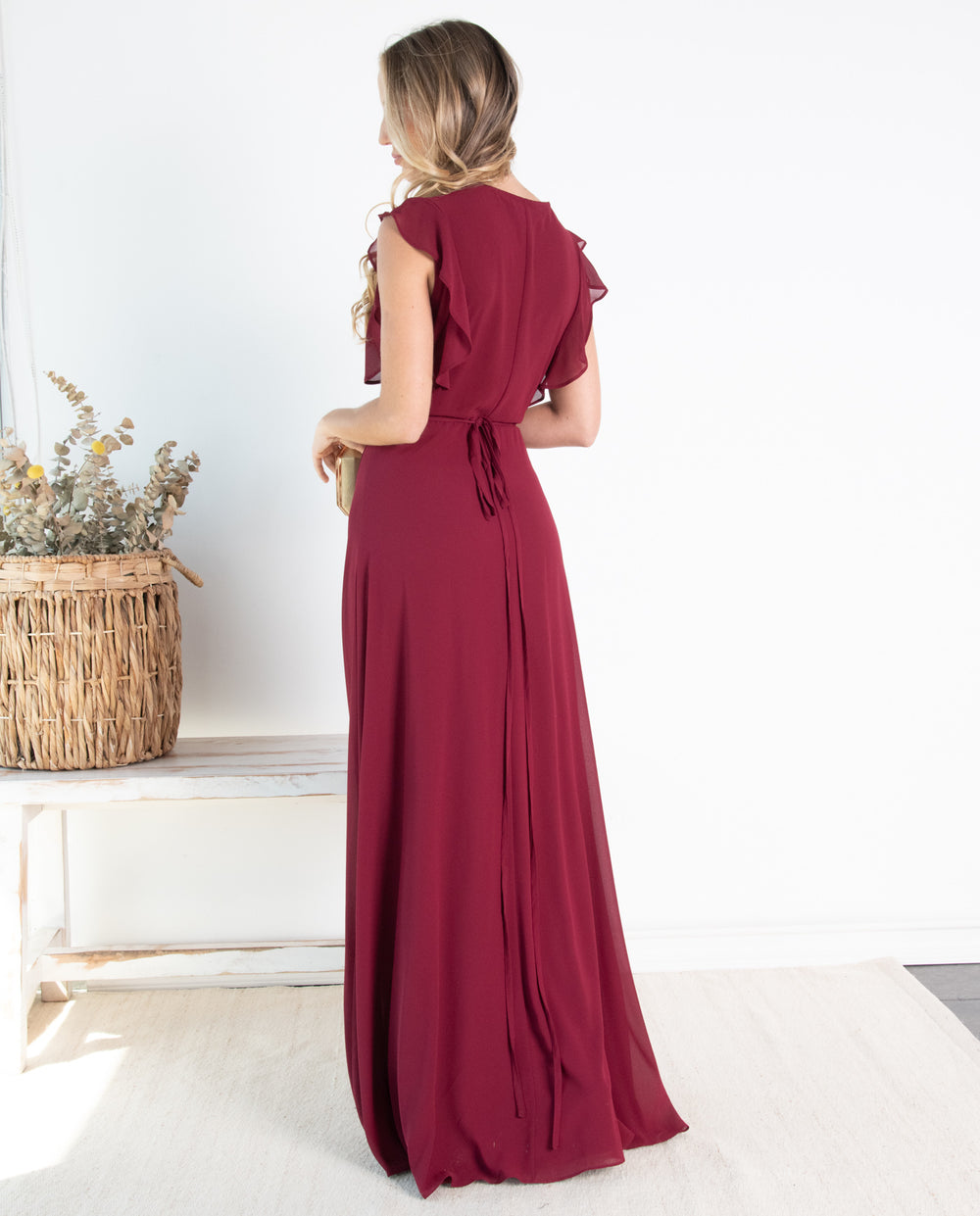 Nuestro vestido largo Clara esta confeccionado en gasa y forro interior. Su diseño es envolvente, lo que permite que se adapte muy bien a los distintos cuerpos y tallas. Tiene un corte de cintura, desde donde cae su falda con una abertura en la pierna. La espalda es cerrada y tiene unos pequeños vuelos que simulan mangas. Este vestido lo puedes usar de día y noche, en matrimonios al aire libre o interior.