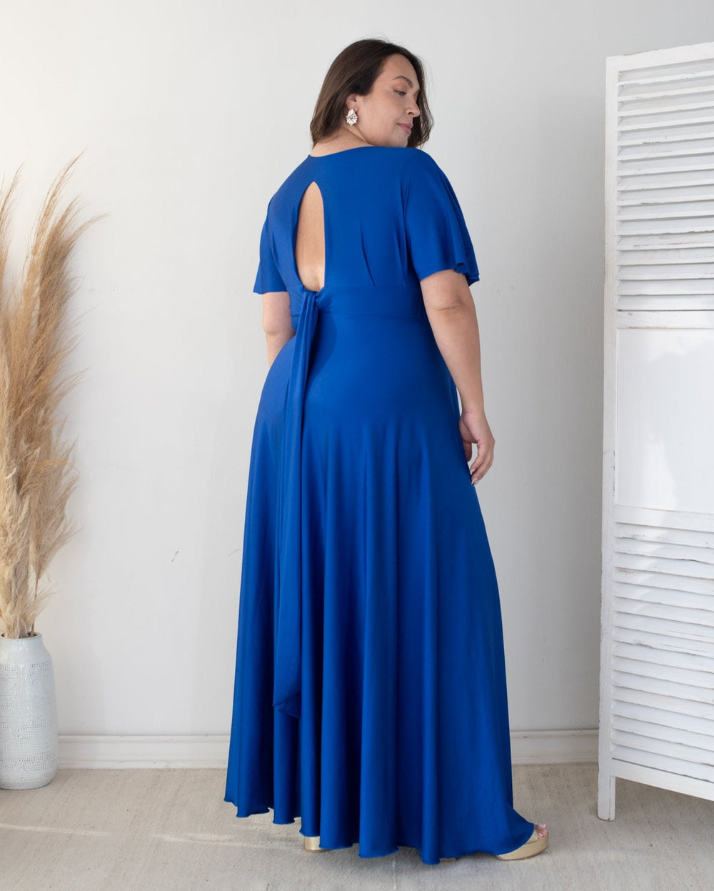 Noa  es un vestido largo de fiesta confeccionado en lycra dupont, que es una tela ultra elástica que se adapta muy bien al cuerpo.  Tiene un escote en V y mangas anchas. Su diseño tiene un corte que resalta la cintura, acompañado de un lazo que puedes amarrar hacia adelante o en la espalda. Además tiene una abertura vertical en la espalda que le da un toque único. Tiene un amplio faldón con una linda caída. ¡Este vestido tiene un peso y movimiento increíble! Lo puedes usar de día o noche, en matrimonios al aire libre o interior y graduaciones. Lo puedes complementar según la ocasión, te aconsejamos si es de día, utilizar colores contrastantes, en formatos de aros más casuales como flecos o aros de papel. Si es de noche, puedes usar colores más clásicos como dorado, plateado o brillantes. Este vestido tiene un escote en V estiliza tu cuello, además te sentirás cómodo y seguro por la forma del escote y sus mangas abiertas.