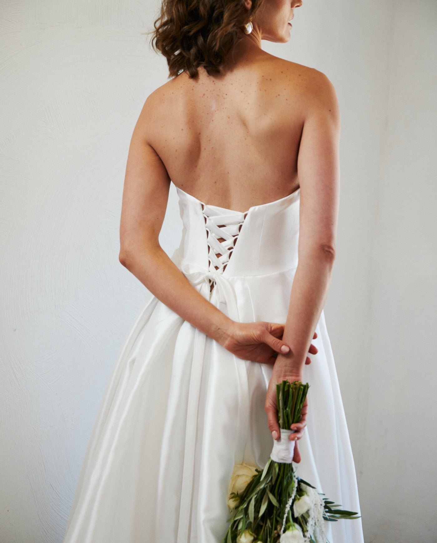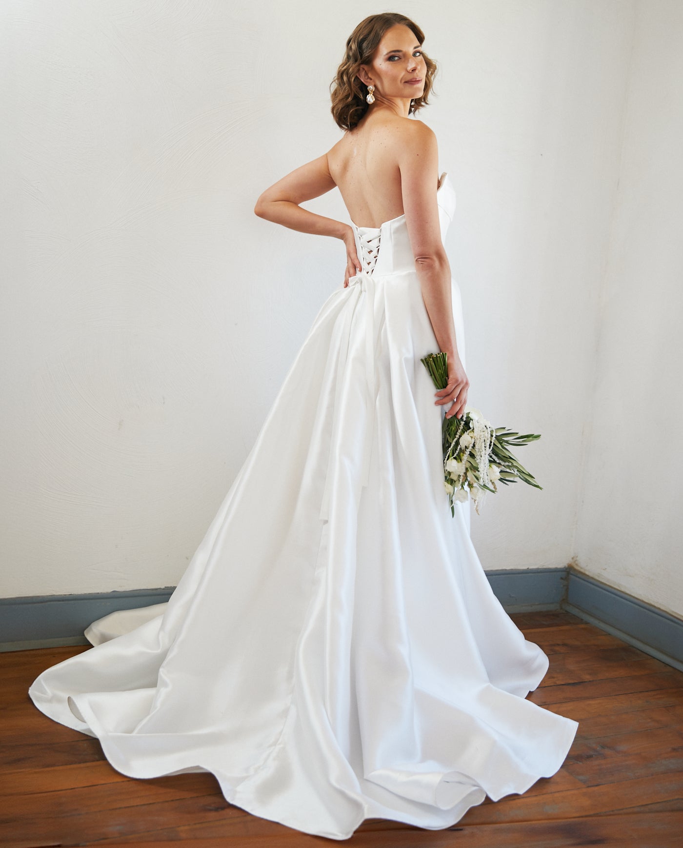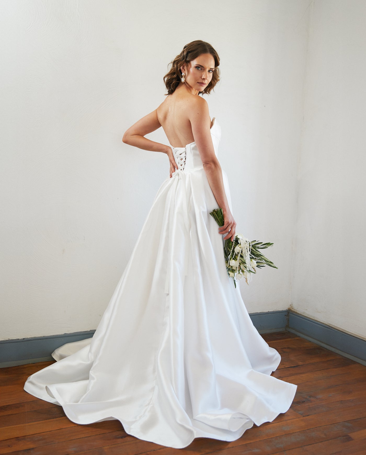 Con un escote strapless que enmarca delicadamente los hombros y una falda amplia de caída impecable, este diseño equilibra estructura y suavidad en perfecta armonía.
