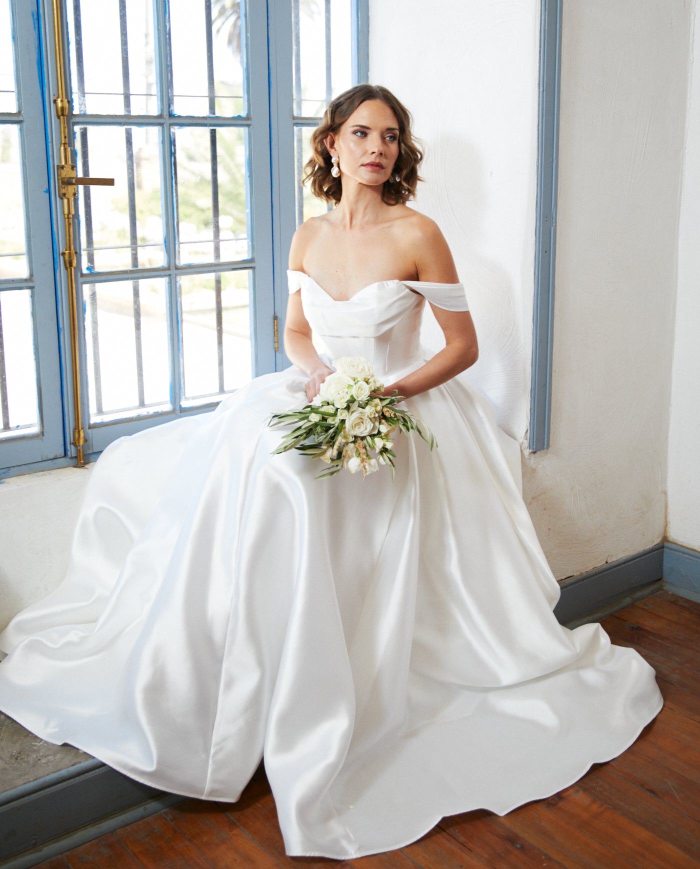 Pensado para novias clásicas y sofisticadas, el vestido incorpora hombros caídos que son totalmente desmontables y delicados lazos ajustables en la espalda, que permiten adaptarlo con precisión a cada cuerpo. Su cola posterior realza la silueta y aporta un sello distintivo lleno de carácter.
