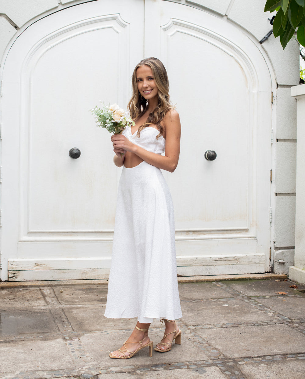 Nuestro vestido Lola es un vestido midi confeccionado en tela semi elastica y texturada. Tiene un escote en forma de corazón asimétrico, su top tiene una abertura en forma de triángulo bajo el busto, una de sus mangas tiene pequeños volados que contornean el hombro.