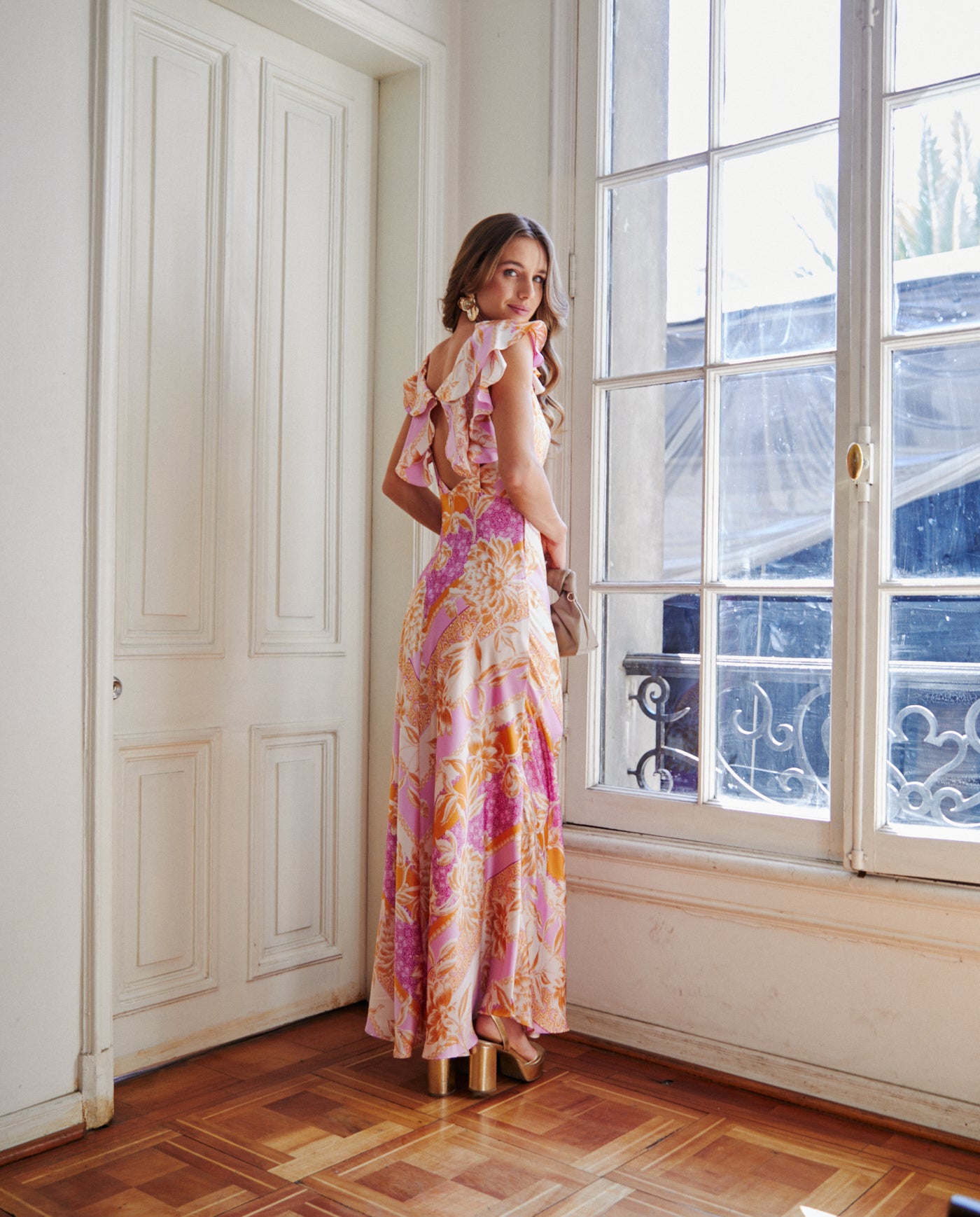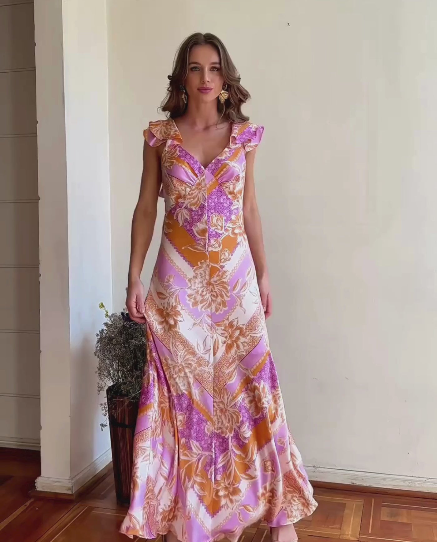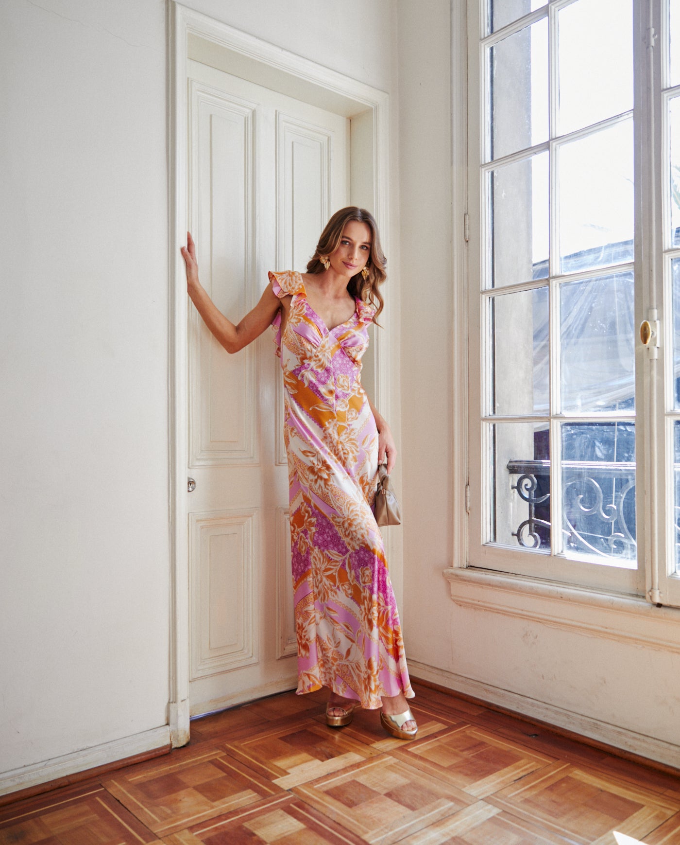 Vestido Largo de Fiesta Canela Fondo Rosado confeccionado en Satín rosado, con vuelos mangas que realzan la figura de forma natural. Su diseño largo ofrece un look elegante ideal para invitada matrimonio de día, titulación.