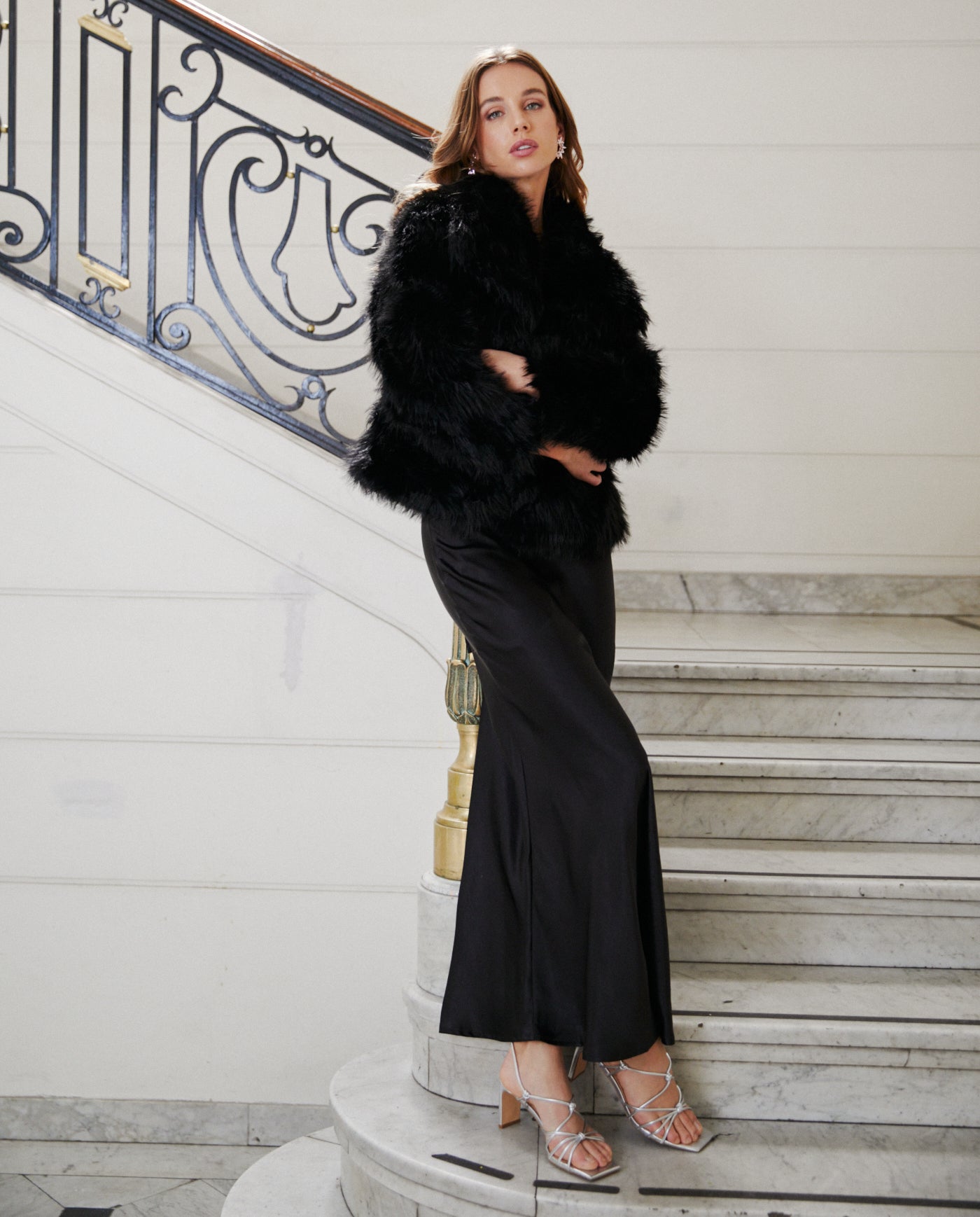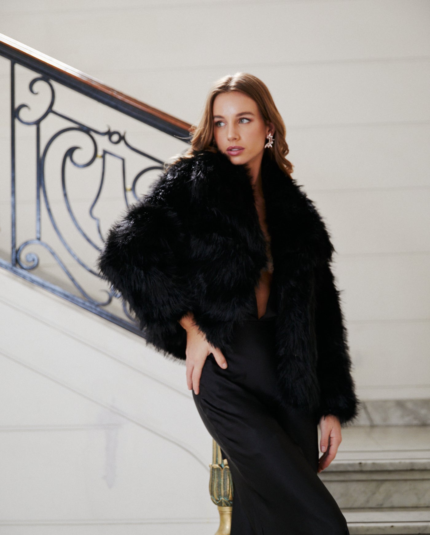 Peludo Lucia Negro es un chaqueta confeccionado en tela textura tipo piel en tono negro. Un accesorio versátil y elegante, ideal para complementar vestidos de fiesta y de novia, aportando estilo y calidez a tu look en cualquier evento especial.