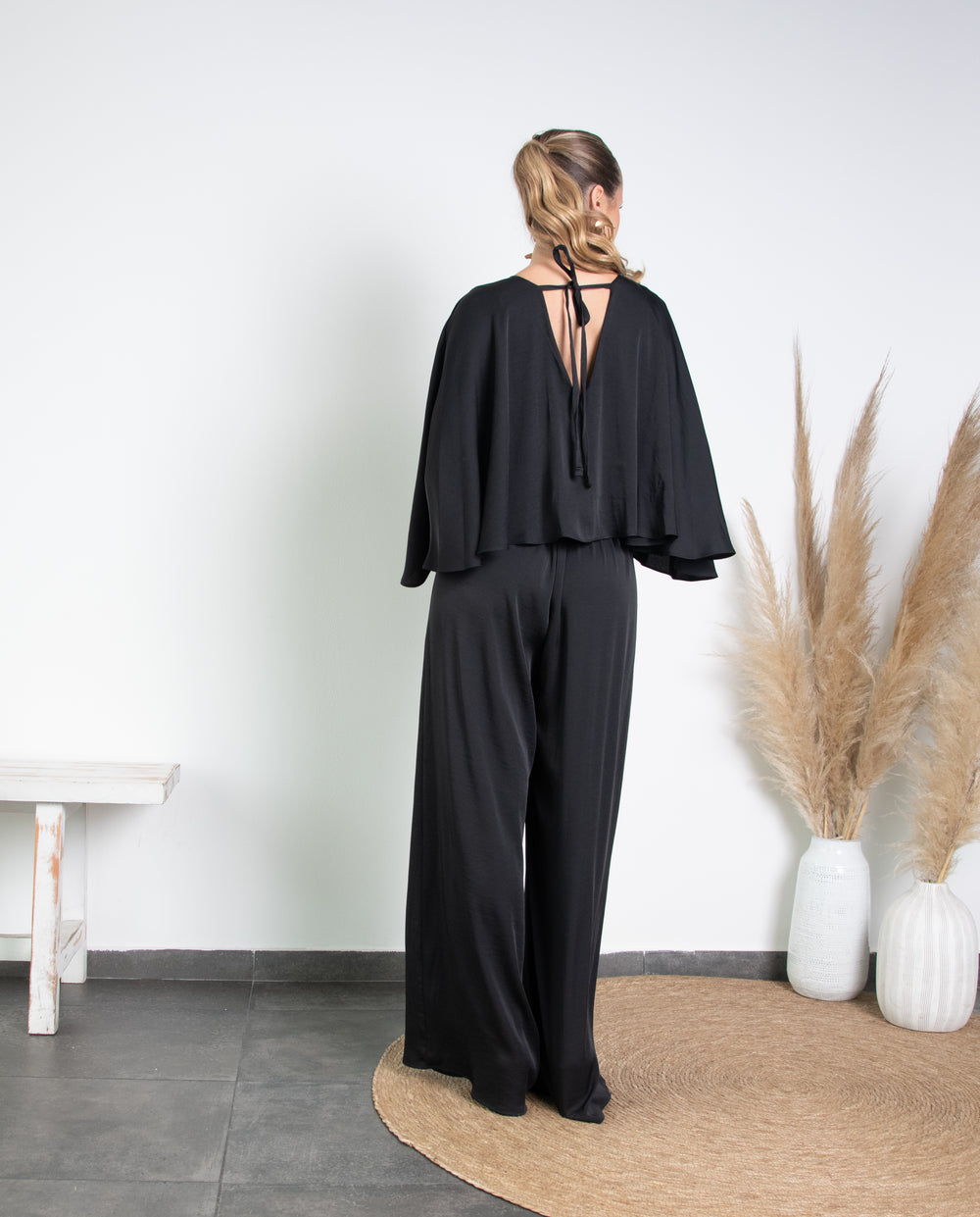 El Enterito Inés es un enterito largo confeccionado en USA con una tela de fresca, liviana y sútilmente satinada. Tiene un diseño suelto, con escote profundo y mangas estilo kimonos y su espalda posee una capa con una pequeña abertura que cubren los brazos maravillosamente. Posee un corte elasticado en la cintura, que permite que se adapte muy bien a las distintas tallas. Su pantalón es ancho y suelto, tiene una caida increible.