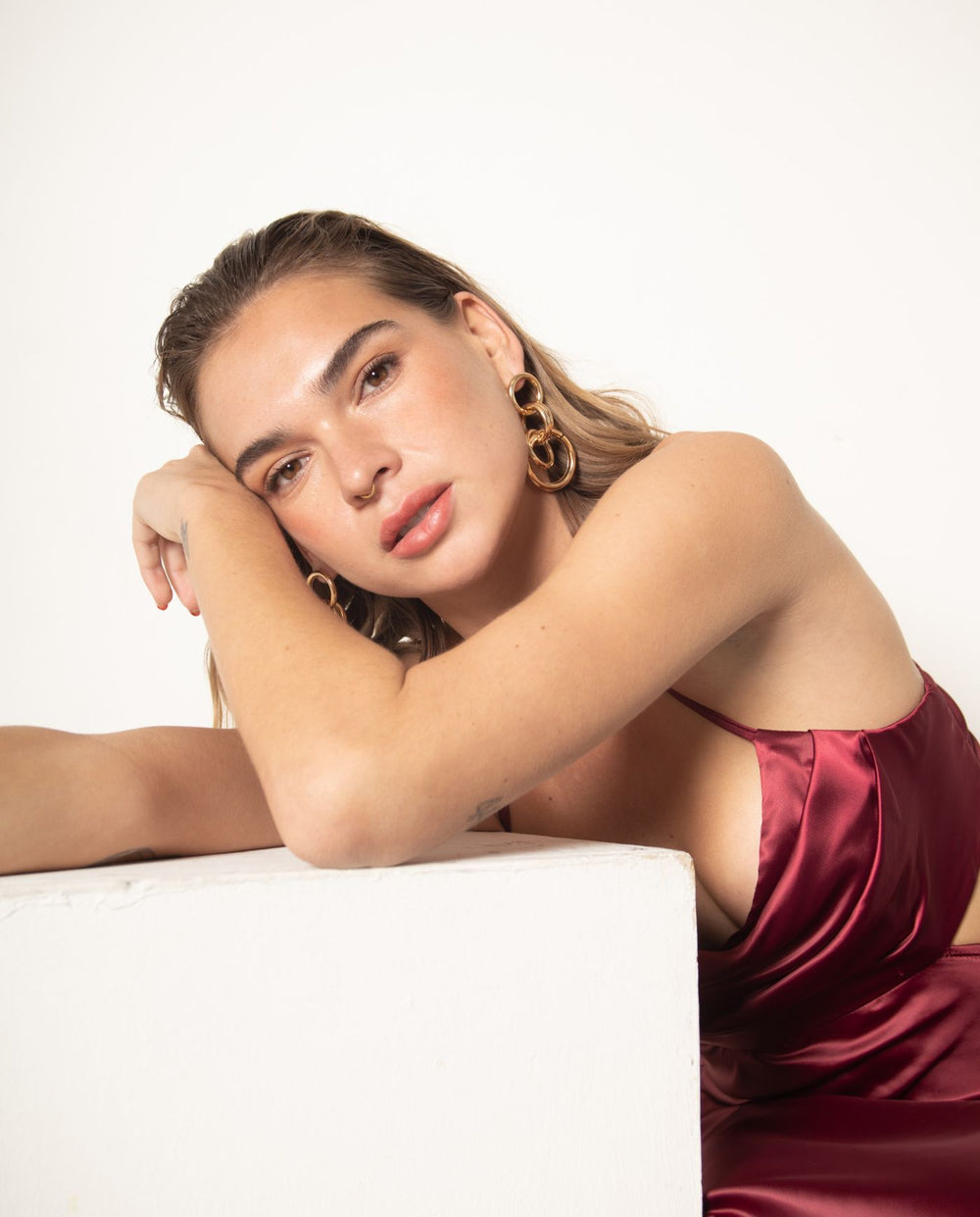 Carol es un vestido largo de fiesta con corte sirena, confeccionado en una tela plana, no elasticada y satinada. Su diseño moderno cuenta con un escote redondo y un drapeado en el área del busto. Su diseño “cut out” tiene dos aberturas en la cintura que estilizan la figura. En la espalda, cuenta con un elástico horizontal lo que hace adaptarse a todo tipo de cuerpo. Cuenta con cierre en la parte de atrás y tirantes ajustables.