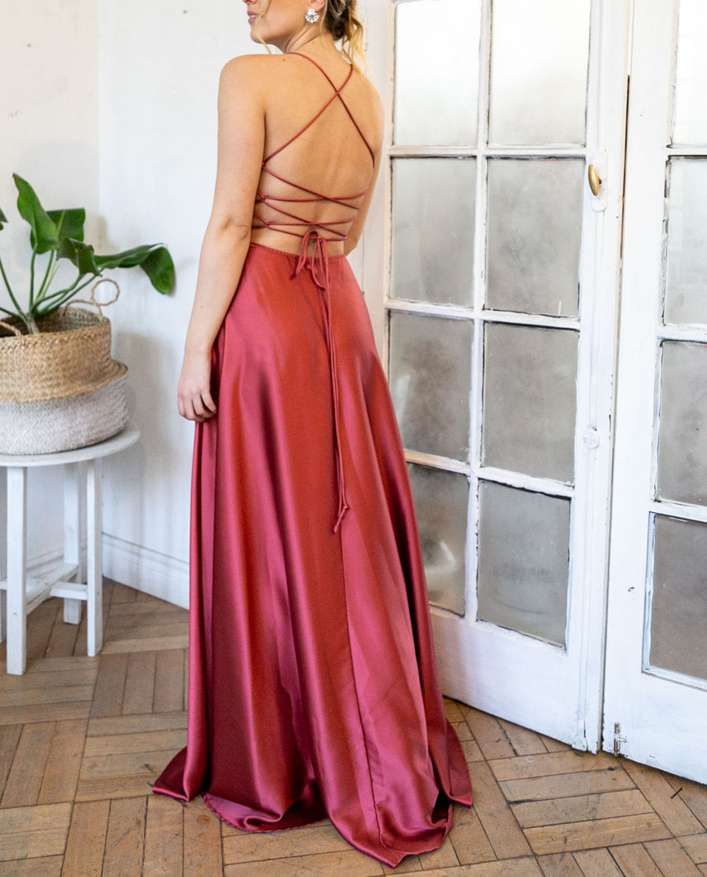 Rafa es un vestido largo de fiesta, confeccionado en tela satinada no elasticada. Tiene un escote recto, con dos tirantes ajustables que se cruzan en la espalda, que tiene un escote profundo. Desde el corte en la cintura, cae una falda lisa con una abertura en la pierna, que te permitirá moverte libremente.