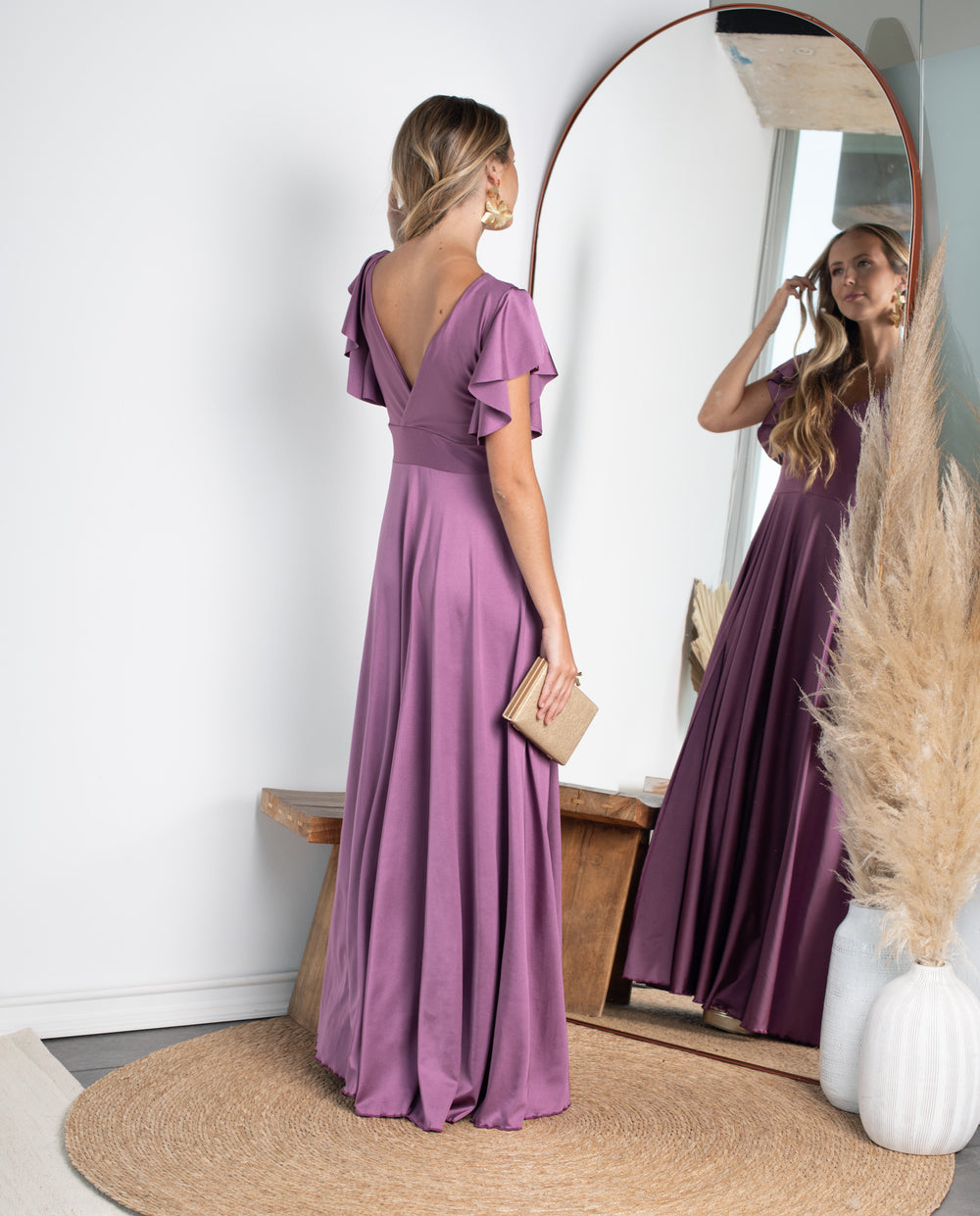 Es un vestido versátil que puede ser usado tanto para un matrimonio de noche, como para un evento en el día, todo depende de los accesorios que complementen el look. Puedes usar aros en tonos dorados, plateados o brillos para lograr un estilo clásico y elegante. También puedes darle un look más informal con aros de flecos o de papel en tonos que contrasten el vestido.