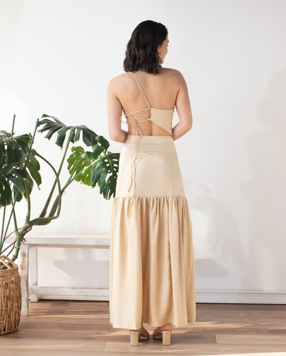 Nuestro vestido Medellín es un vestido largo confeccionado en tela plana, no elasticada y semi satinada. El diseño de su escote es asimétrico con dos delgados tirantes al lado izquierdo, estos se ajustan y anudan en al espalda permitiendo ajustar la parte superior delantera del vestido para mayor comodidad. Cuenta con un corte estilo cut out que resalta la cintura. Su falda es semiajustada en las caderas y bajo estas posee un corte desde el cual el diseño tiene un vuelo que llega hasta el ruedo. Además en el lado izquierdo desde este corte posee una abertura para mayor libertad en los movimientos. Posee un cierre invisible al lado izquierdo de la falda.