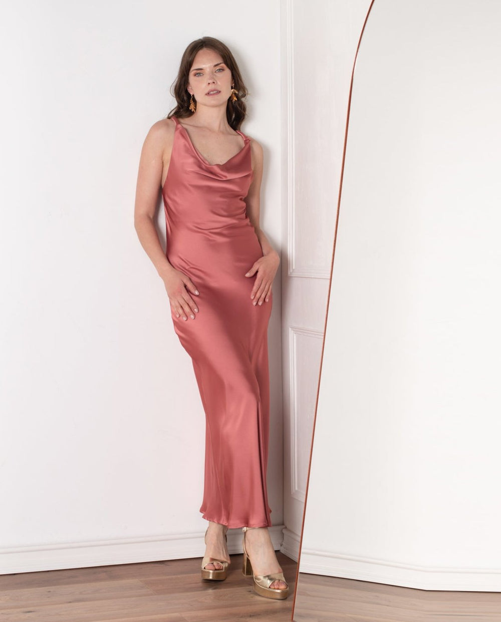 Nuestro vestido Monstserrat está confeccionado en tela satinada, no elasticada. El escote tiene un sútil drapeado y posee tirantes dobles que se unen y que van hacia la espalda y se cruzan en el medio de la espalda. El diseño tiene un corte recto, por lo que se ajusta sutilmente sobre las caderas. Este vestido lo puedes usar de día o de noche, en matrimonios, eventos de empresas, graduaciones, etc. Recomendamos dejar el escote libre para lucir el diseño drapeado del vestido. Este vestido estiliza tu cuello y hombro. Si tienes poco busto, este escote será perfecto para ti.