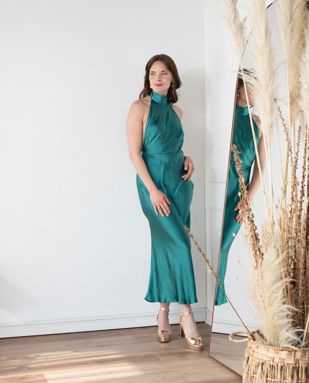 Toledo es un vestido largo, confeccionado en tela satinada. Posee escote halter y botones en la parte posterior del cuello que permiten cerrar el vestido. El diseño es semi ajustado en las caderas y cae recto hasta el ruedo. Posee una espalda totalmente rebajada, que cae drapeada en la parte baja. El diseño posee aplicaciones de perlas que se cruzan la espalda. Este vestido, lo puedes usar de día y de noche, en matrimonios al aire libre o interior, graduaciones y eventos corporativos.