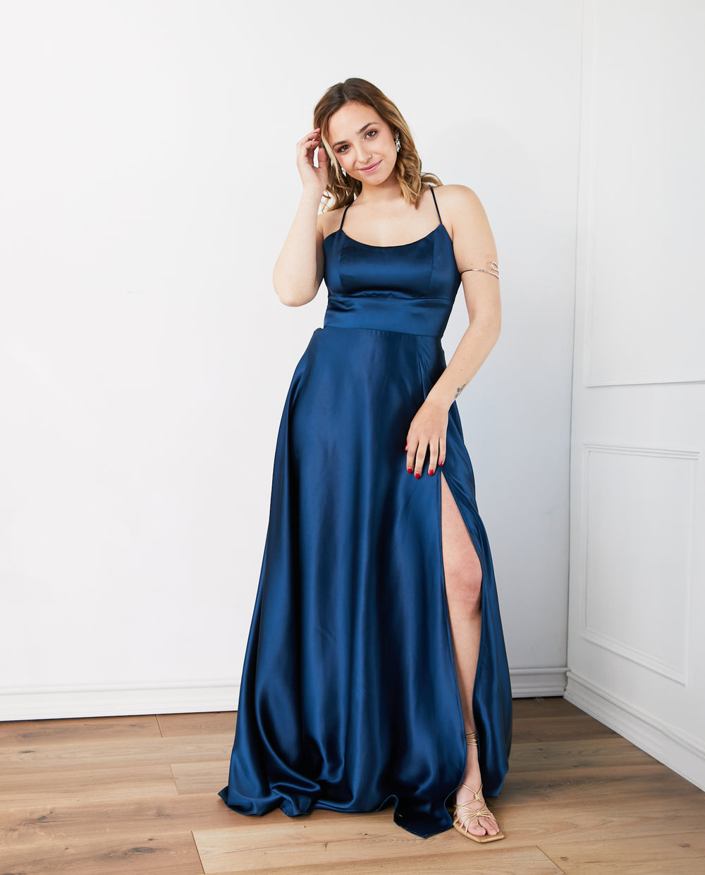 Rafa es un vestido largo de fiesta, confeccionado en tela satinada no elasticada. Tiene un escote recto, con dos tirantes ajustables que se cruzan en la espalda, que tiene un escote profundo. Desde el corte en la cintura, cae una falda lisa con una abertura en la pierna, que te permitirá moverte libremente.