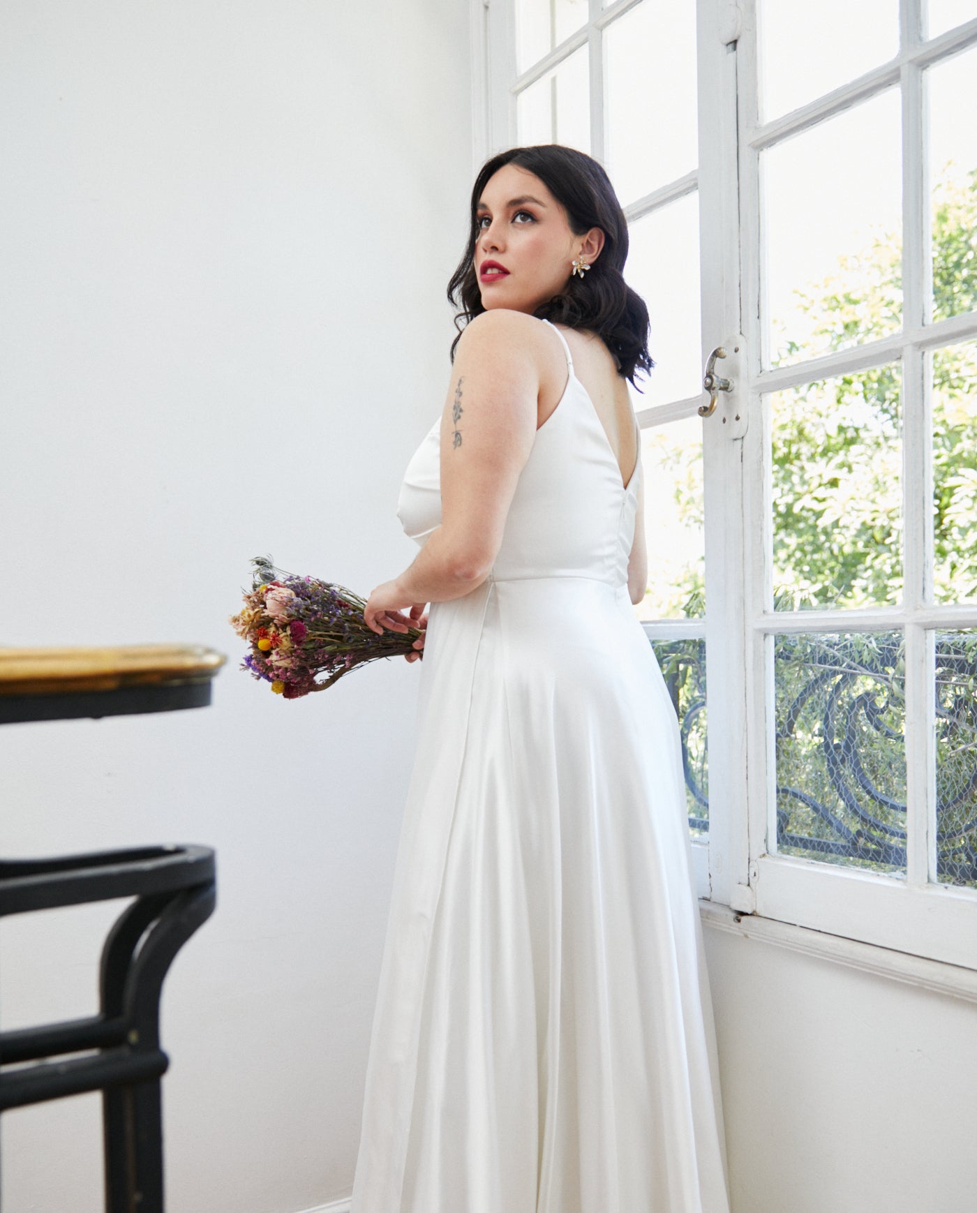 Vestido Largo de Novia Amaris Ivory confeccionado en tela no elasticada, con abertura lateral que realzan la figura. Su diseño con un diseño equilibrado entre elegancia y comodidad lo convierte en una opción elegante para novias civil, novia segunda tenida, novia ceremonia. Este diseño es parte de nuestra Colección COLECCIÓN PROPIA.