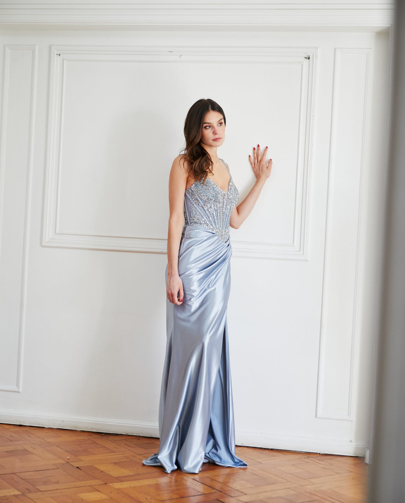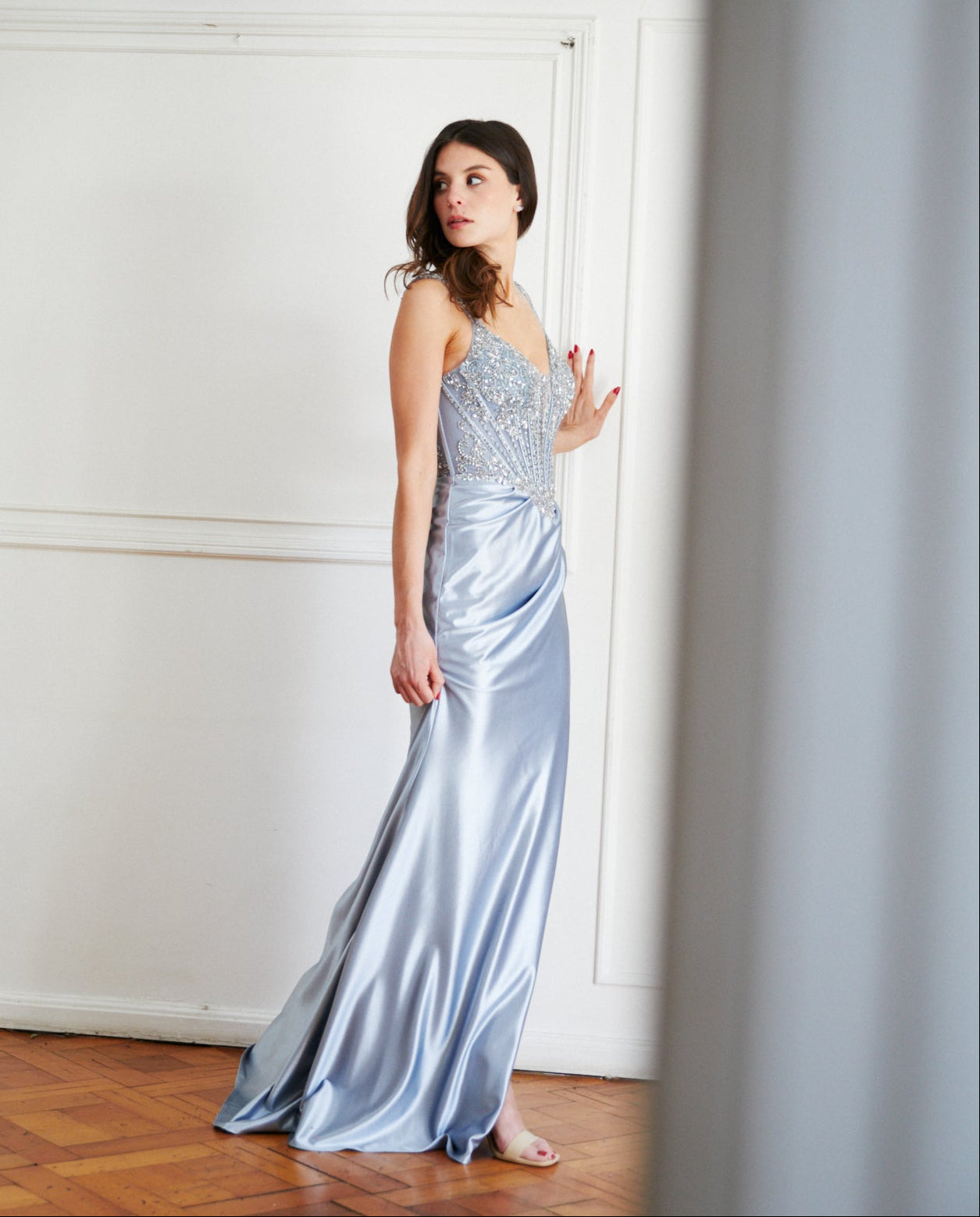 Vestido Largo de Fiesta Madrid Celeste confeccionado en tela elasticada, con abertura lateral que realzan la figura. Su diseño de falda larga y caída fluida lo convierte en una opción elegante para invitada matrimonio de noche, graduación, fiesta empresa, fiesta gala. Este diseño es parte de nuestra Colección EE.UU.