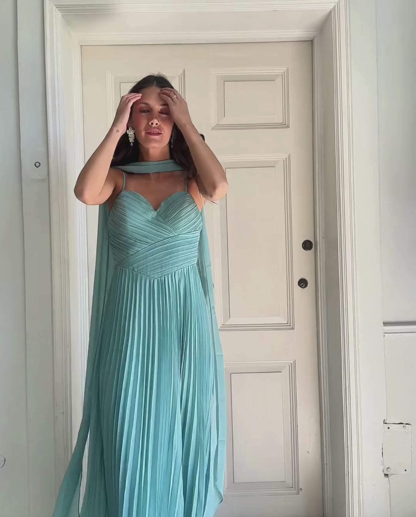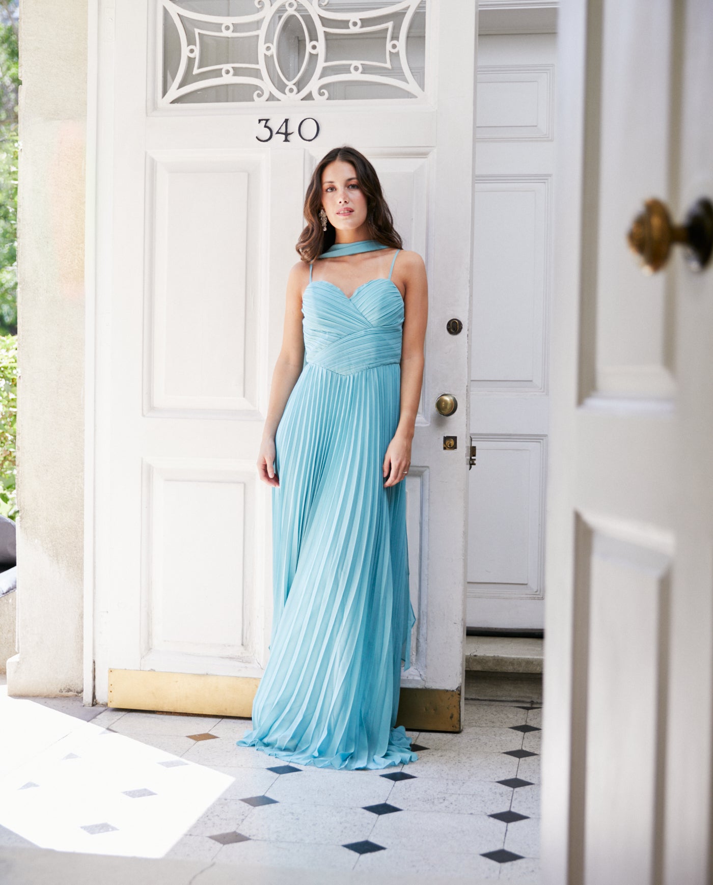 Vestido de Fiesta Largo Milagros Celeste confeccionado en tela no elasticada, con tirantes ajustables, choker/lazo que realzan la figura. Su diseño de falda larga y caída fluida lo convierte en una opción elegante para invitada matrimonio de noche, graduación, fiesta empresa, fiesta gala. Este diseño es parte de nuestra Colección EE.UU.