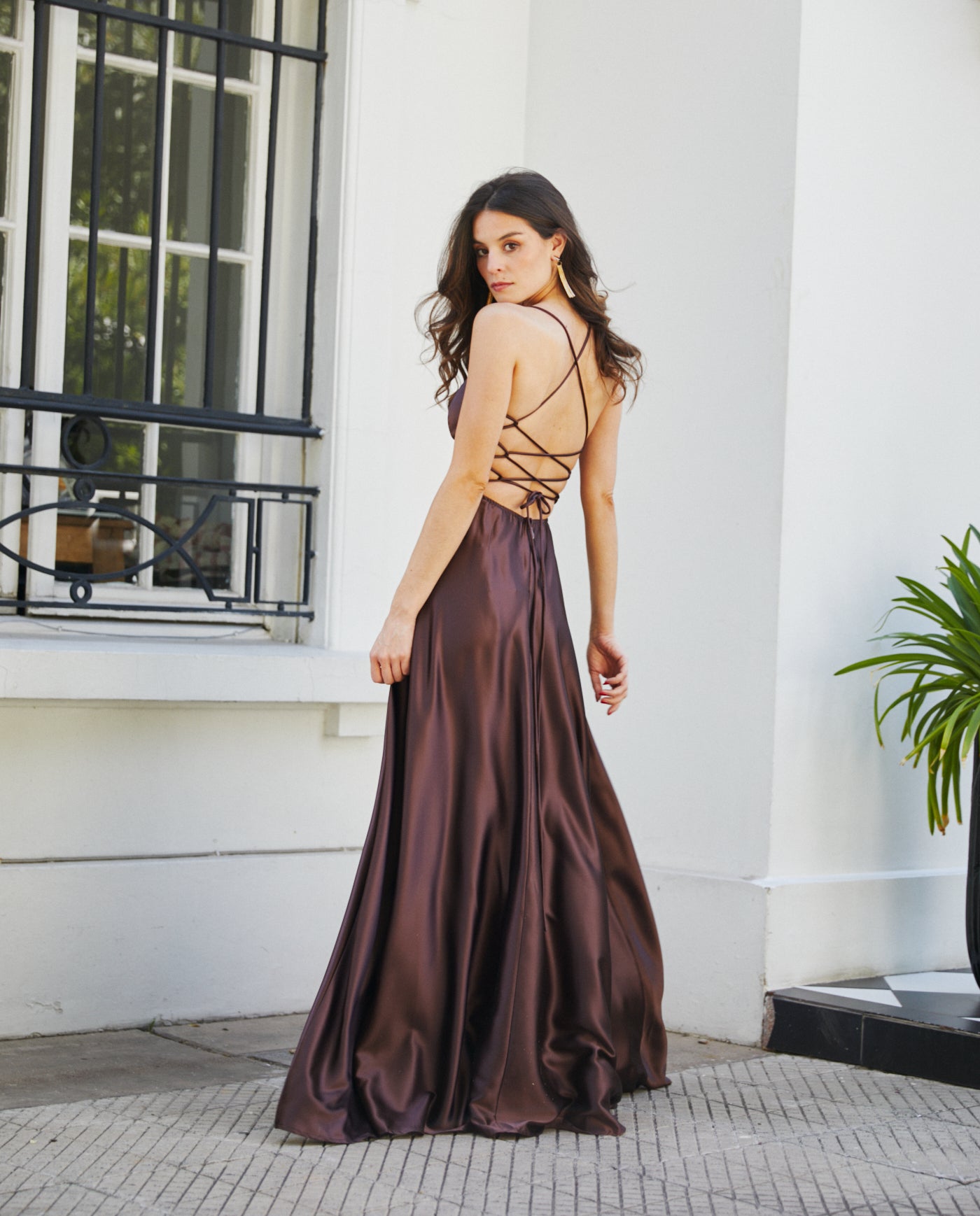 Vestido Largo de Fiesta Rafa Chocolate confeccionado en tela no elasticada, con abertura lateral, vestido espalda rebajada, tirantes ajustables que realzan la figura. Su diseño de falda larga y caída fluida lo convierte en una opción elegante para invitada matrimonio de noche, graduación, fiesta empresa, fiesta gala. Este diseño es parte de nuestra Colección EE.UU.