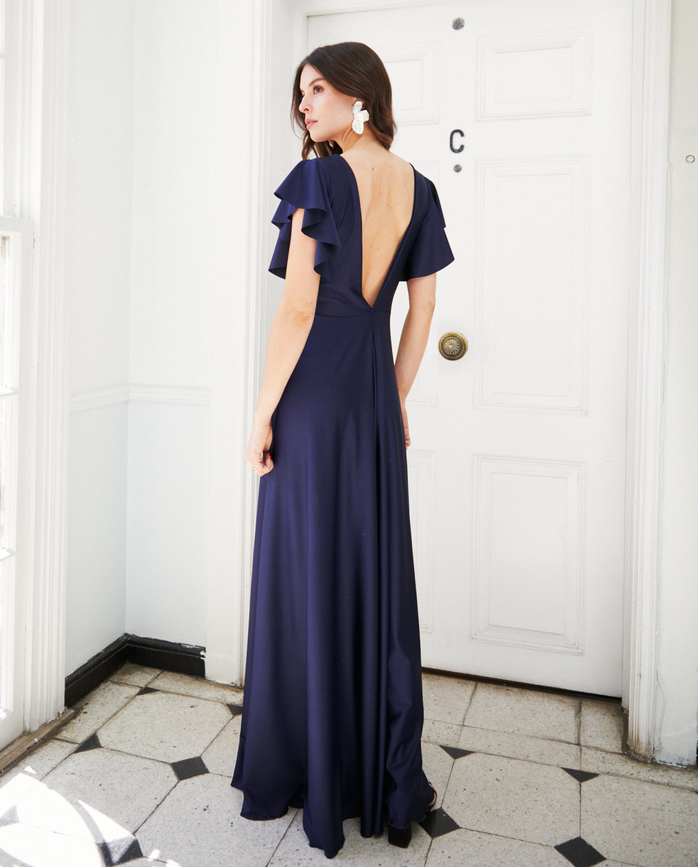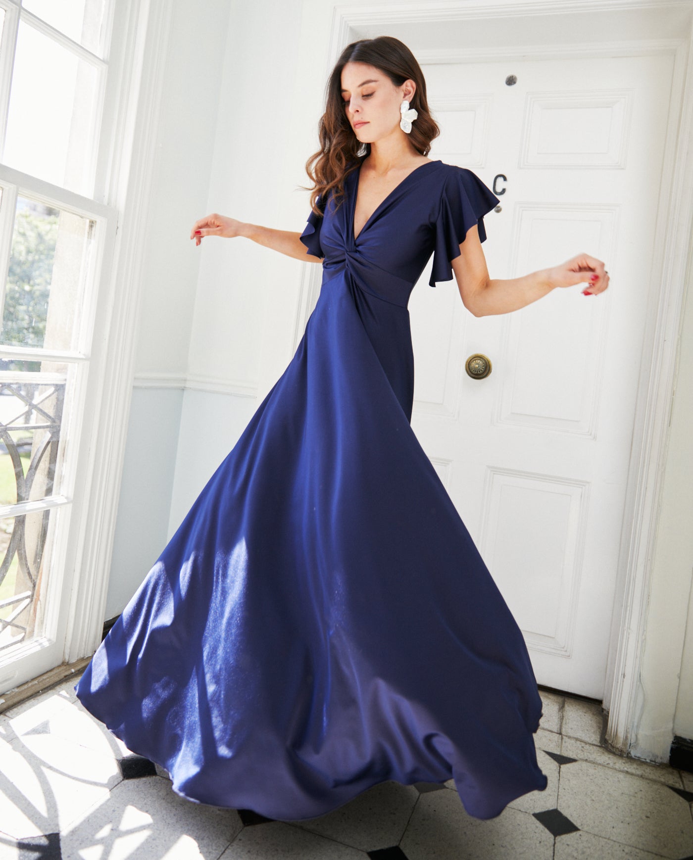 Vestido Largo de Fiesta Vane Azul Oscuro confeccionado en tela elasticada, con abertura en la pierna que realzan la figura. Su diseño de falda larga y caída fluida lo convierte en una opción elegante para invitada matrimonio de noche, graduación, fiesta gala, fiesta empresa. Este diseño es parte de nuestra Colección CHILE.