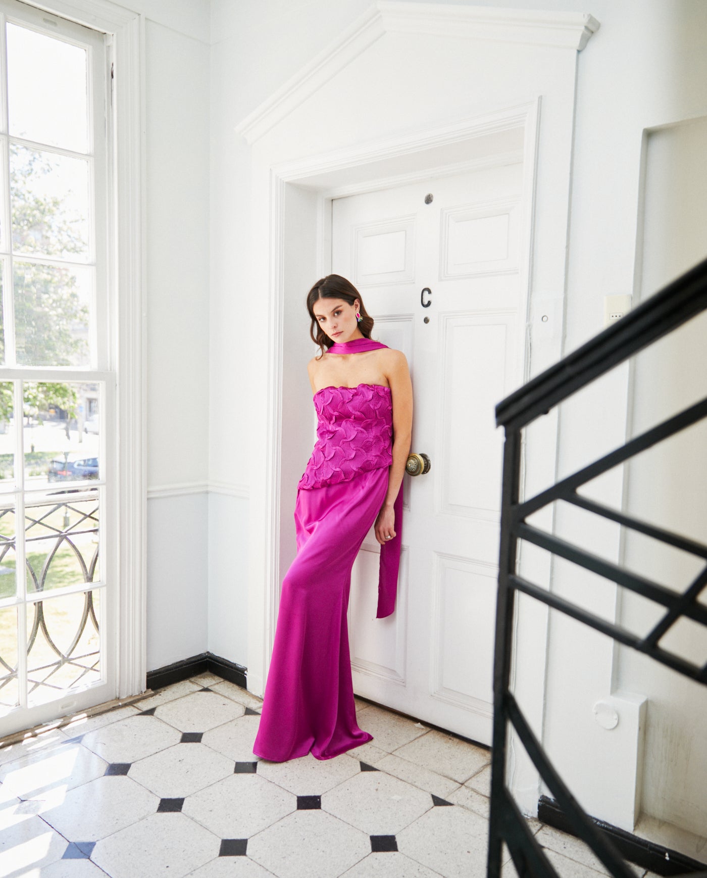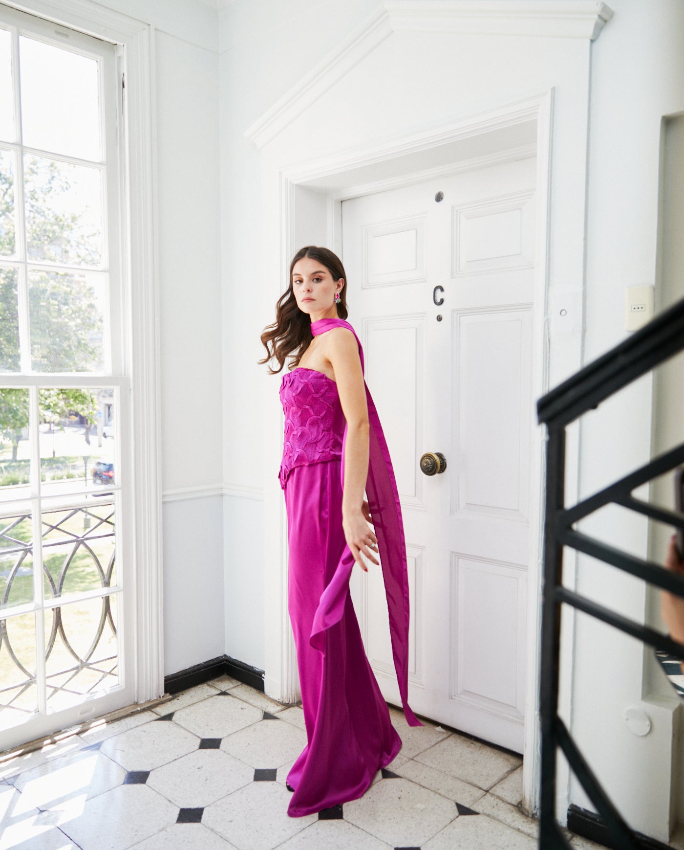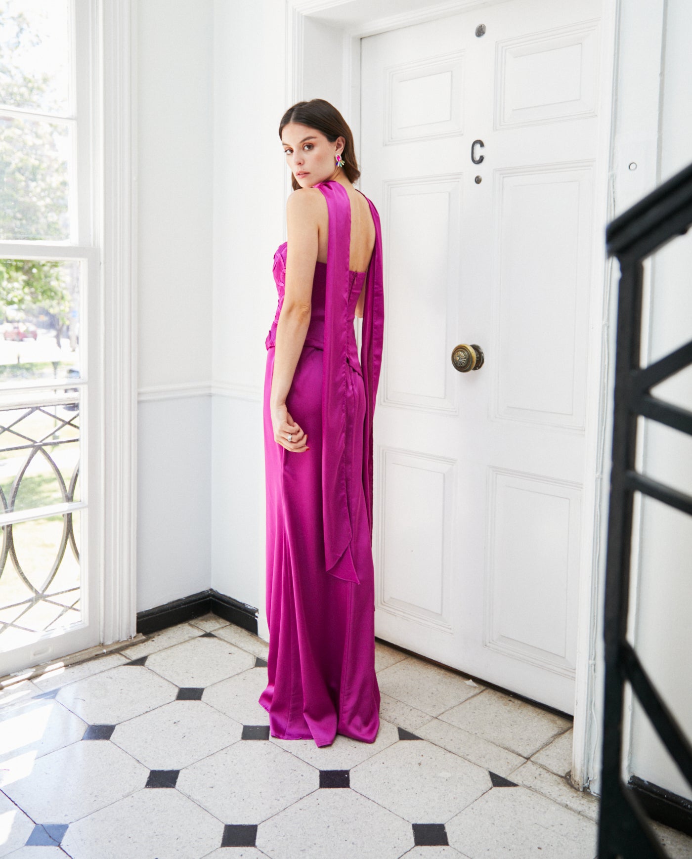 Vestido Largo de Fiesta Violeta Magenta confeccionado en tela no elasticada, con choker/lazo que realzan la figura. Su diseño de falda larga y caída fluida lo convierte en una opción elegante para invitada matrimonio de noche, graduación, fiesta empresa, fiesta gala. Este diseño es parte de nuestra Colección EE.UU.