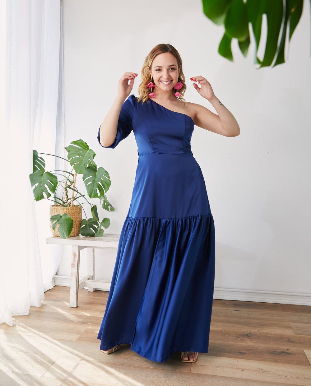 Nuestro Vestido Largo Bogota está confeccionado en satén. Su diseño posee escote asimétrico con sólo una manga, estilo abullonada en el lado izquierdo. El diseño posee elastico en la cintura y una espalda despejada que se ajusta con dos tirantes que se amarran y caen.