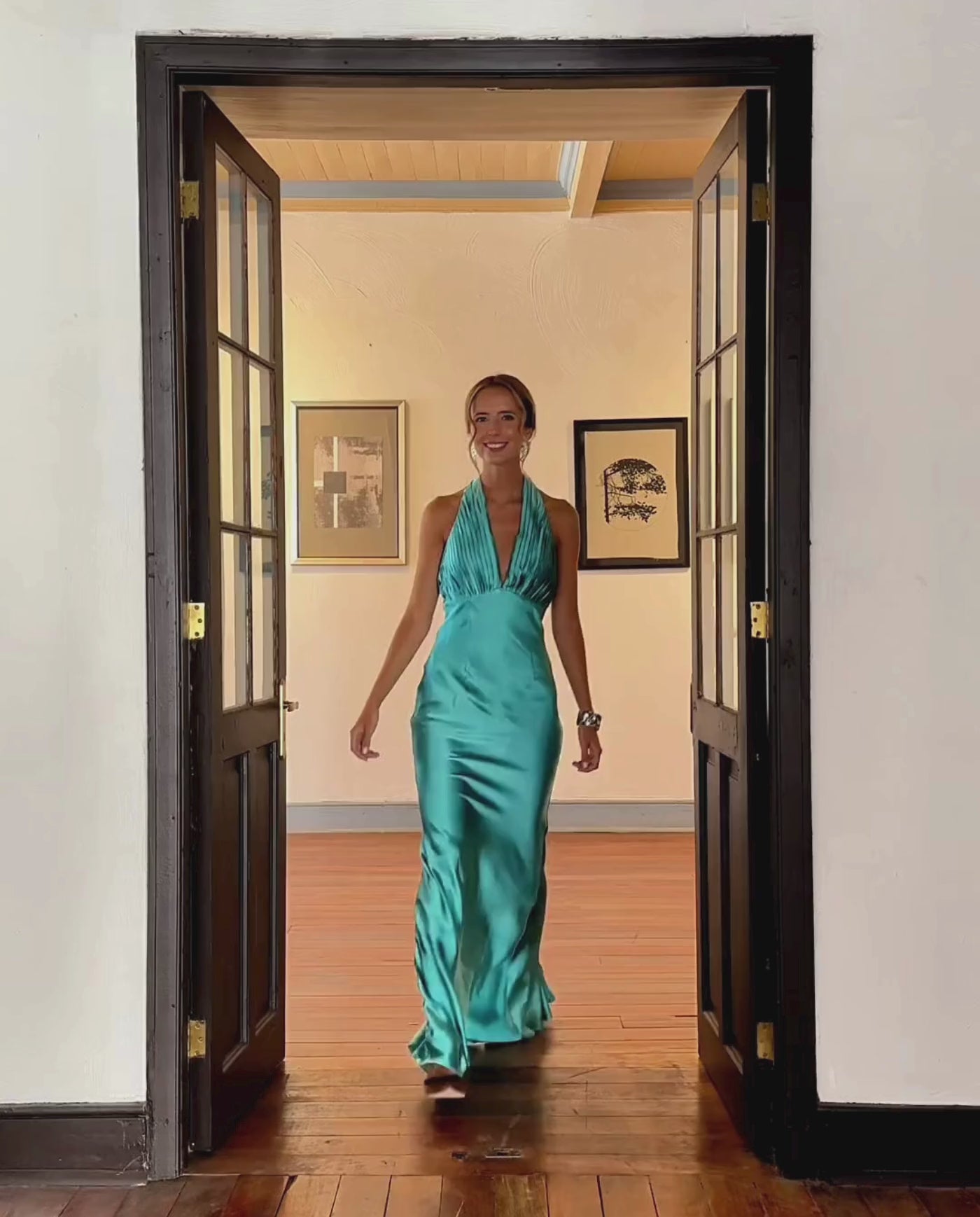 Vestido Largo de Fiesta Maria Fernanda Turquesa Claro confeccionado en Satín, con VESTIDO ESPALDA REBAJADA que realzan la silueta de forma elegante. Su diseño de líneas limpias y caída fluida ofrece un look femenino y sofisticado, ideal para Invitada matrimonio de noche, Graduación, Fiesta gala. Este vestido es parte de nuestra Colección EE.UU.