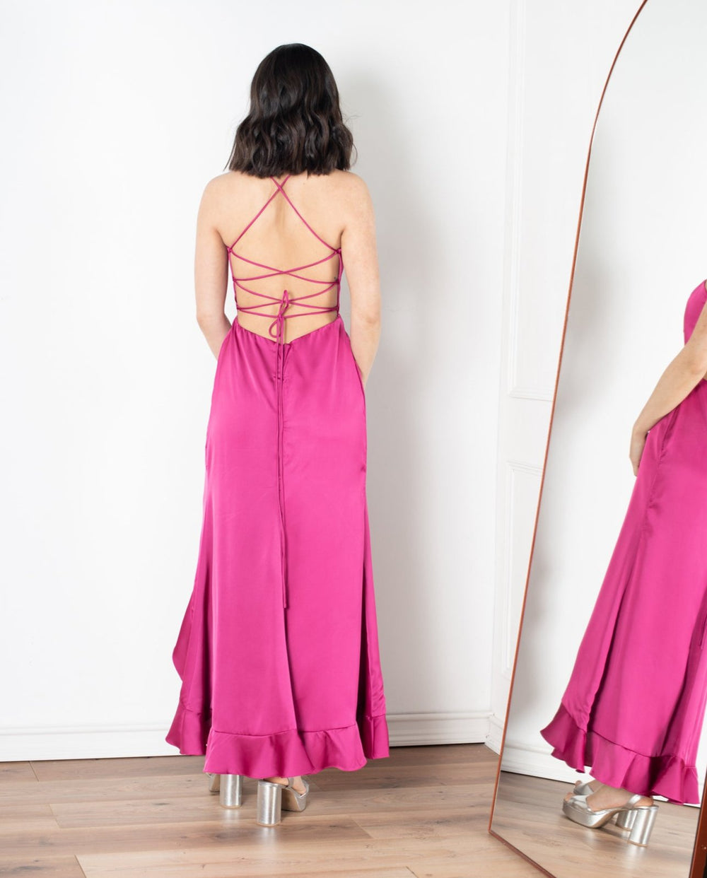 Maxi Olimpia es un vestido largo confeccionado en tela satinada, no elasticada. Posee un vuelo que cruza el contorno del vestido, empezando por el lado izquierdo de la cintura hasta llegar al cruce delantero de la falda. El escote frontal es cuadrado y se afirma por delgados tirantes ajustables que van hacia la espalda, los cuales se entrecruzan en toda la espalda. La falda es de abertura asimétrica, dejando al descubierto las piernas y dando así mucho movimiento al modelo. Este vestido lo puedes usar de día y de noche, para matrimonios al aire libre, cumpleaños, bautizos y eventos corporativos. Este es un diseño muy cómodo y liviano, el corte de falda estiliza nuestra figura y además puedes lucir tus piernas.