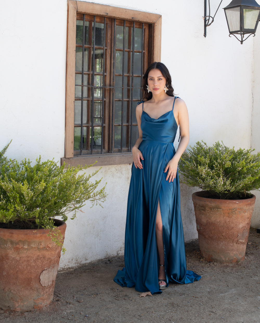 Nuestro vestido Teresa, está confeccionado en tela satinada, semi elasticada. Su diseño tiene escote delantero sutilmente drapeado y su espalda es recta. Posee delgados pabilos que se amarran en la parte superior del vestido y caen, lo que permite ajustar según tu comodidad. Su faldón posee un amplio ruedo y una abertura profunda en el lado izquierdo del faldón, este permite estilizar tu s piernas y moverte con mayor libertad. La parte superior tiene un corte en la cintura, que estiliza la figura. Posee cierre invisible en la espalda. Este vestido lo puedes usar de día y noche, es para todo tipo de matrimonios, al aire libre o interior, graduaciones, galas, etc. En cuanto a los accesorios, te aconsejamos utilizar accesorios en colores clásicos como dorado, plateado o negro.
